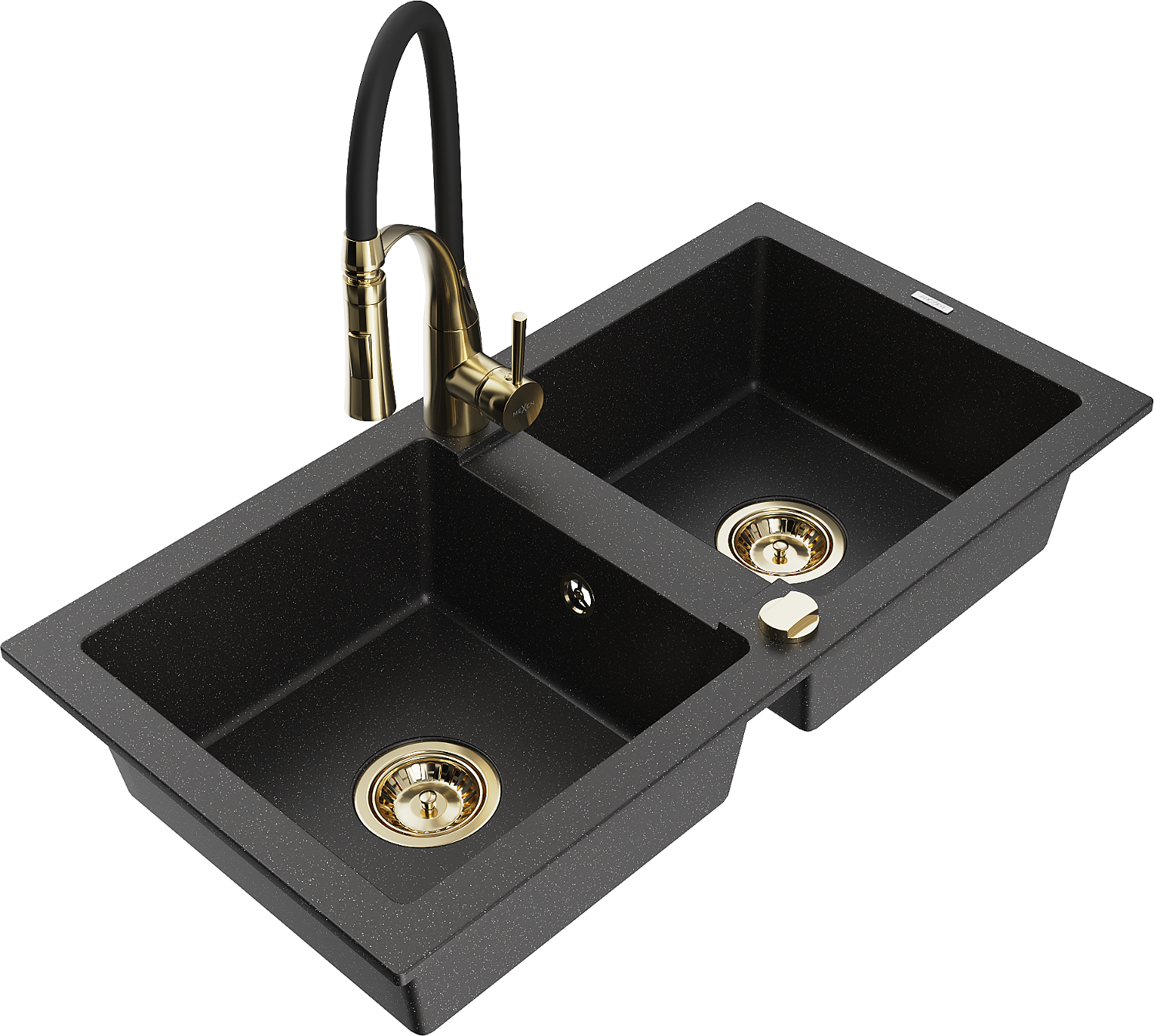 Mexen Mario 2-jų skyrelių granito kriauklė su virtuvės čiaupu Aster, juodas/sidabrinis metalikas - 6504-73-73450-57-G