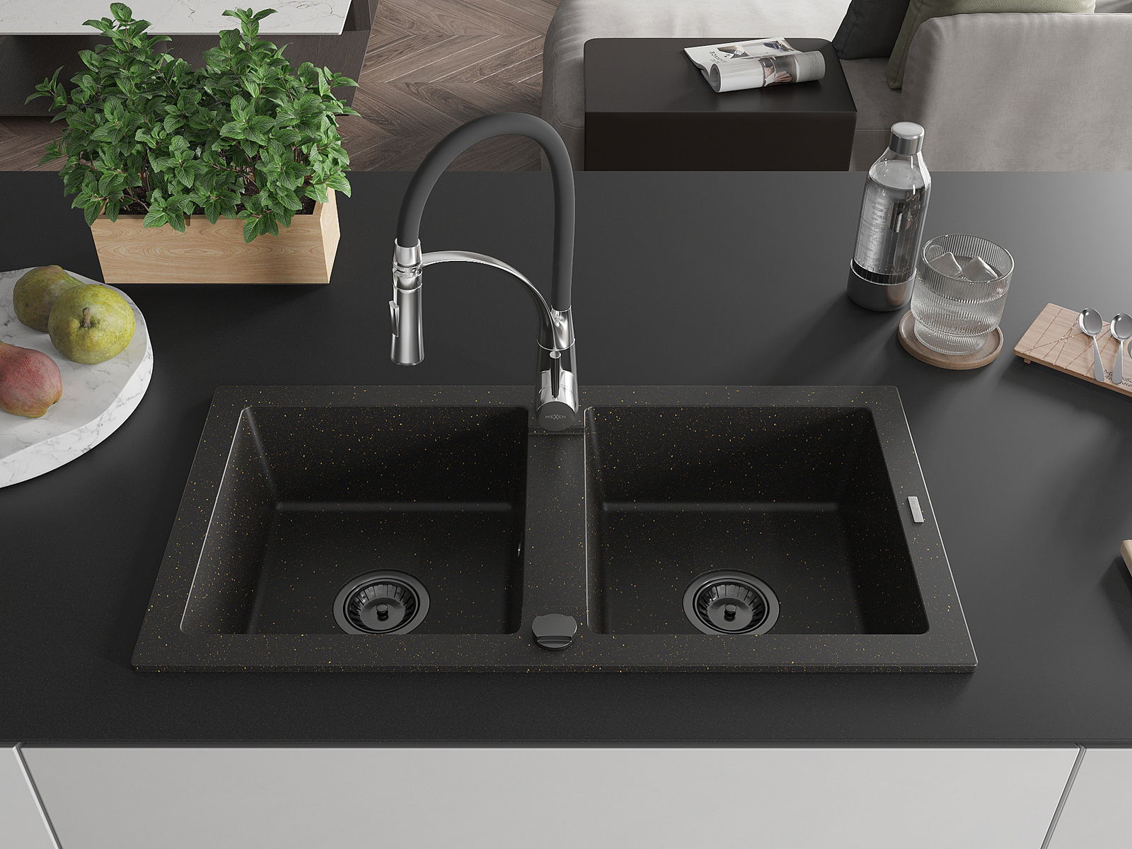 Mexen Mario granitinė dviejų skylių virtuvės kriauklė su maišytuvu Aster, juoda/auksinis metalikas - 6504-75-73450-07-B
