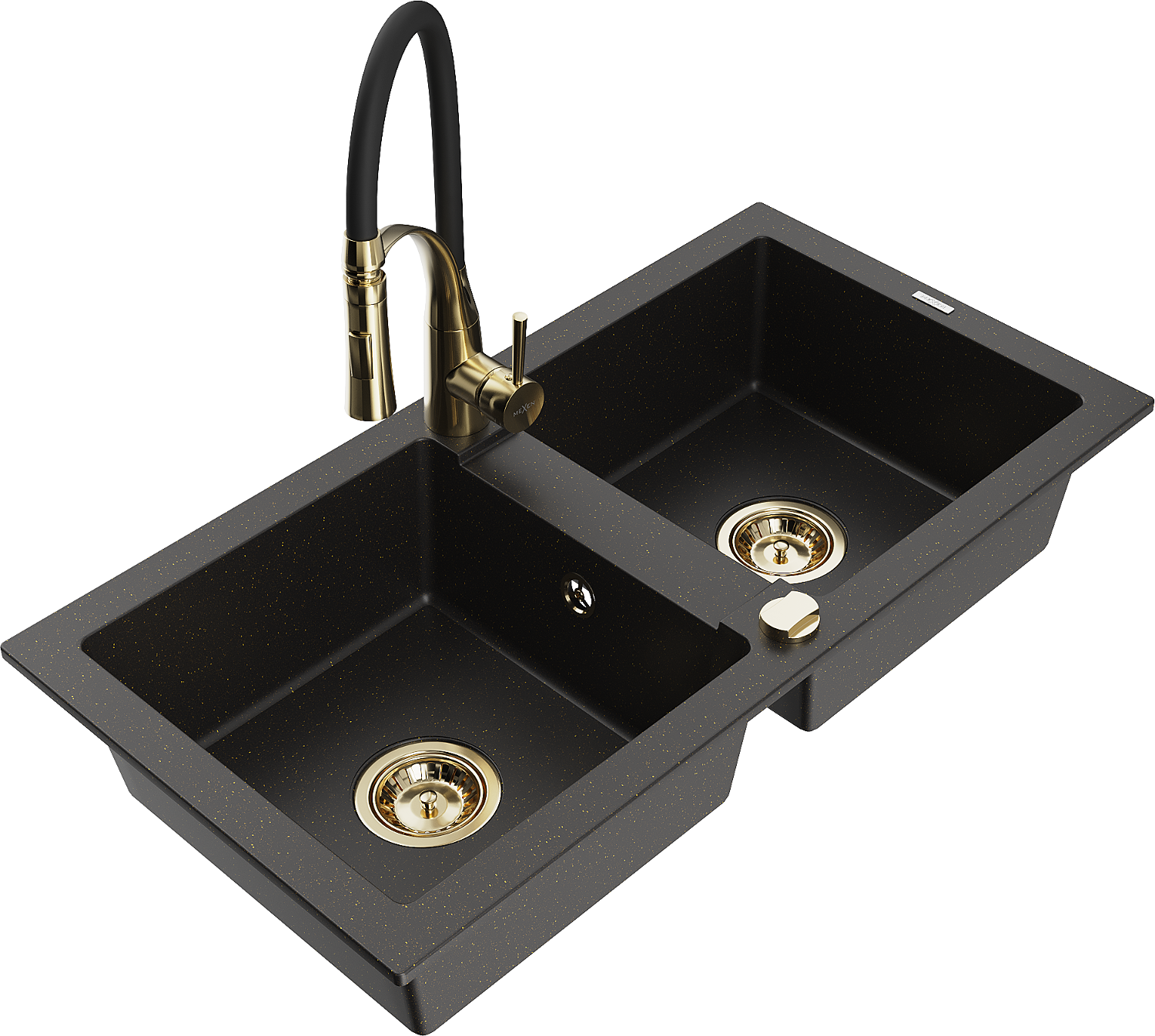 Mexen Mario granitinė dviejų skyrių kriauklė su virtuviniu maišytuvu Aster, juoda/auksinė metalo - 6504-75-73450-57-G