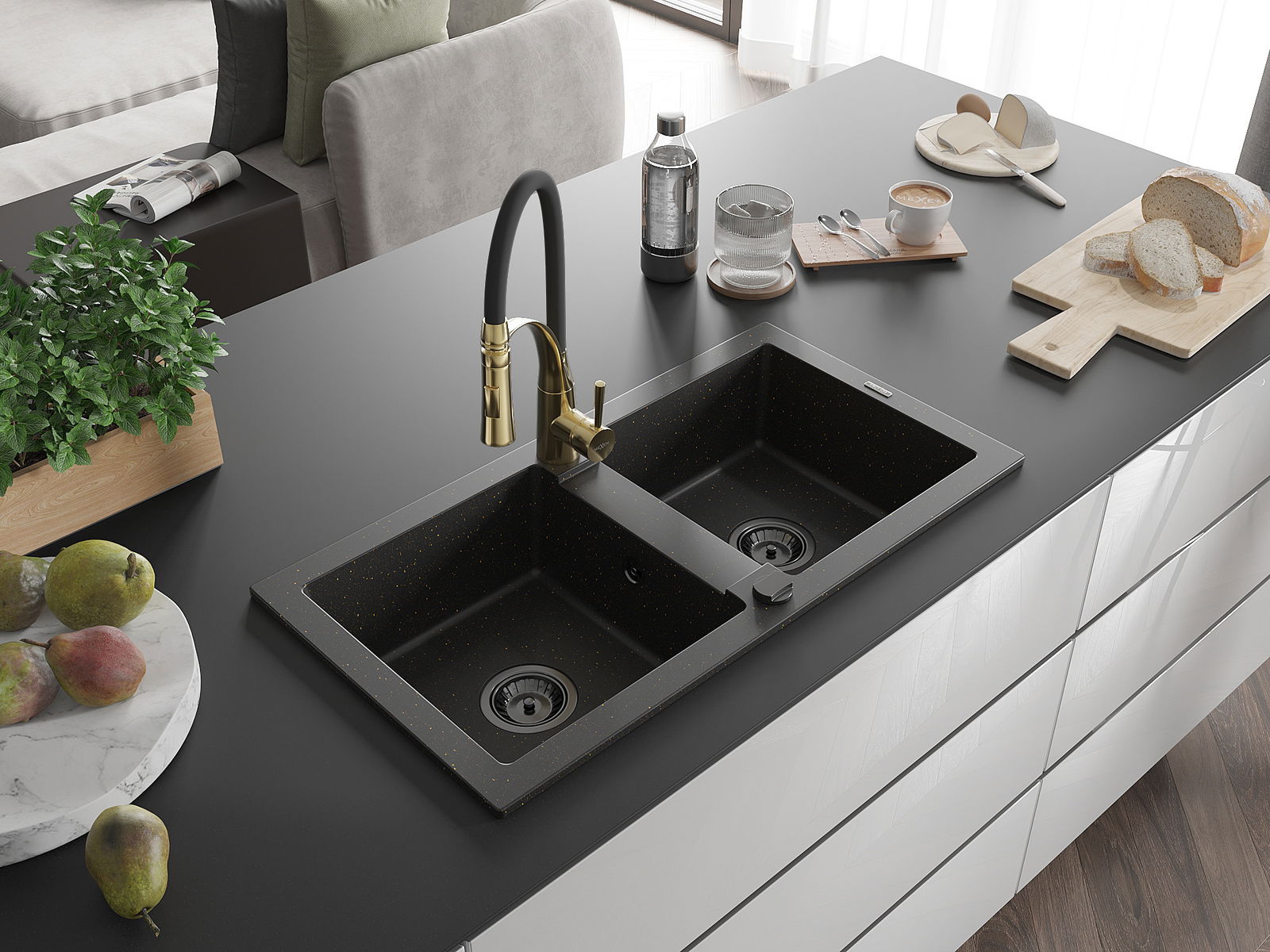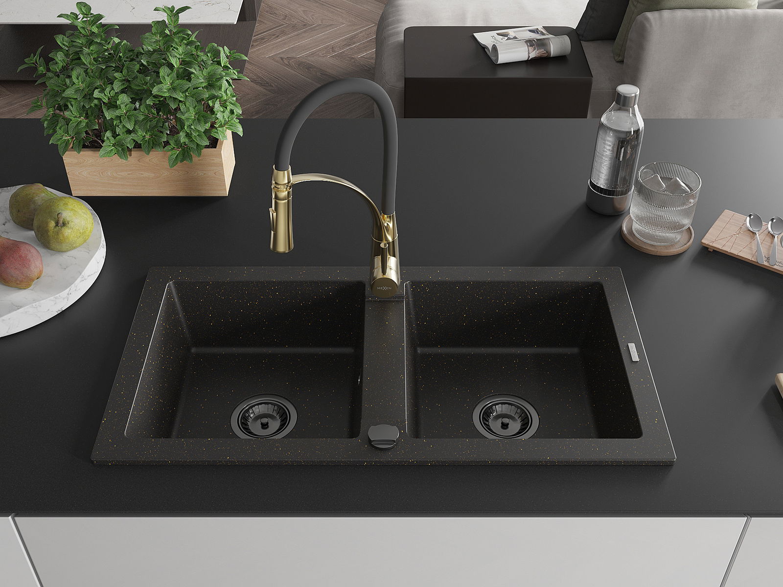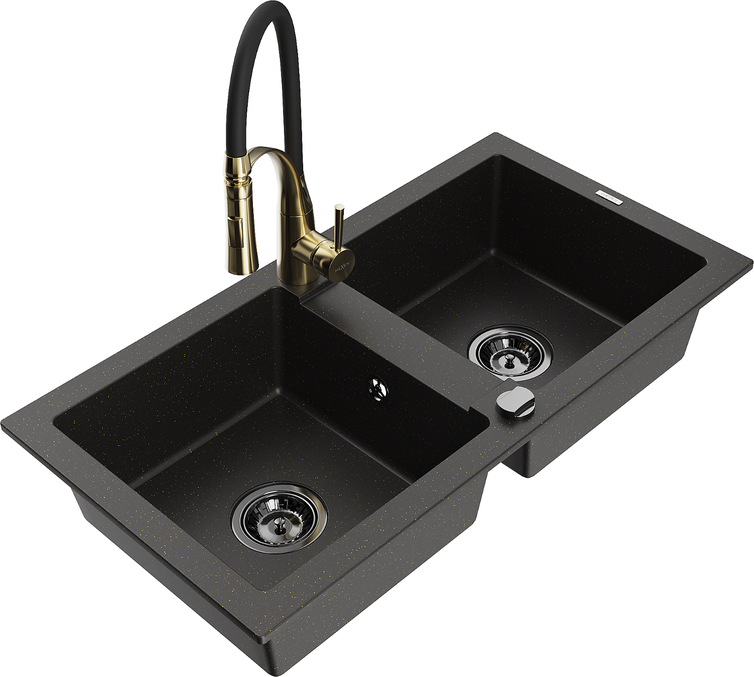 Mexen Mario dviejų skyrių granitinė plautuvė su virtuviniu maišytuvu Aster, juoda/auksinė metalic - 6504-75-73450-57-B