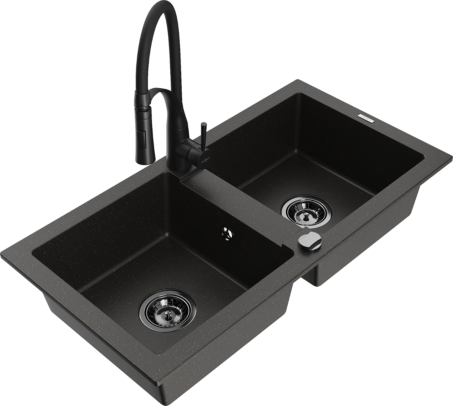 Mexen Mario granitinis dviejų skyrių plautuvas su virtuvės maišytuvu Aster, juodas/auksinis metalikas - 6504-75-73450-70-B