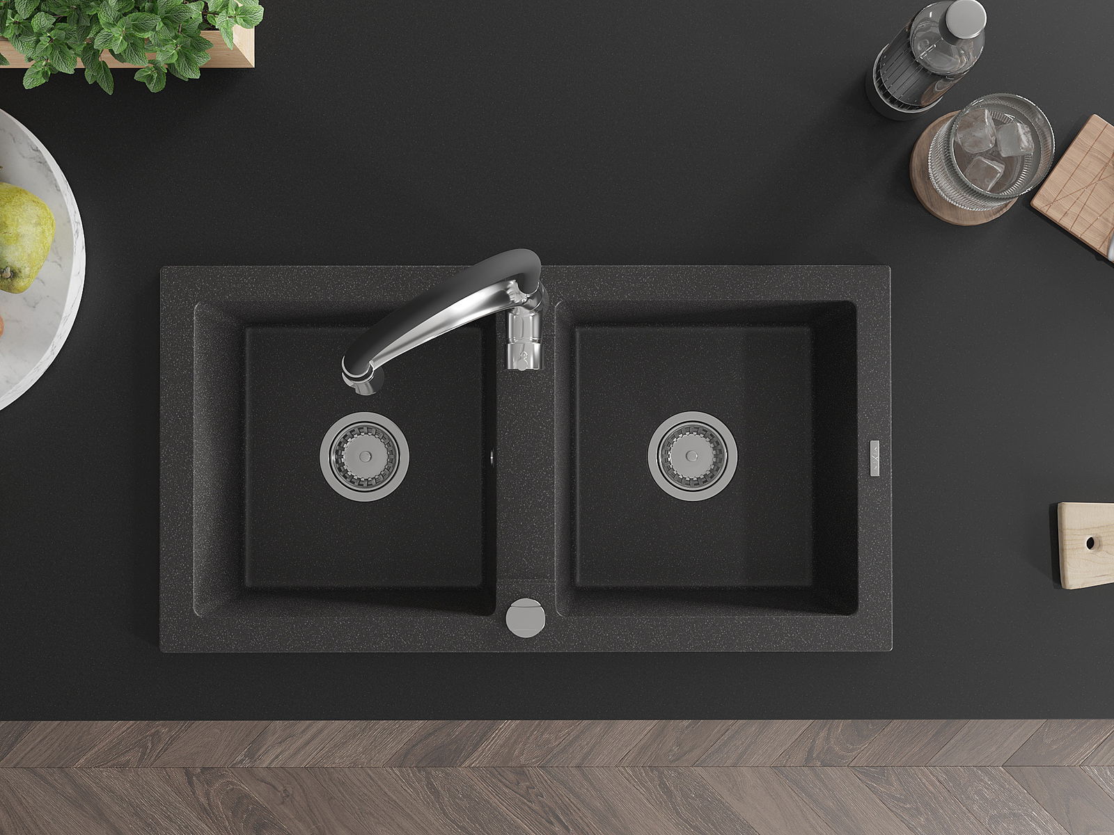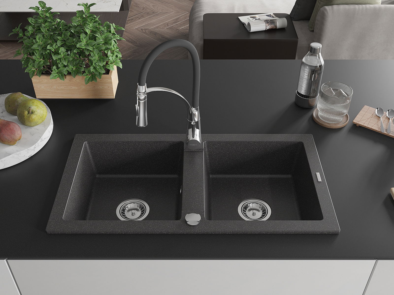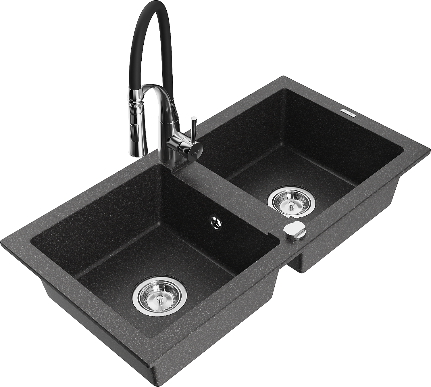 Mexen Mario granito plautuvė su dviem dubenimis ir virtuviniu maišytuvu Aster, juoda su taškeliais - 6504-76-73450-07