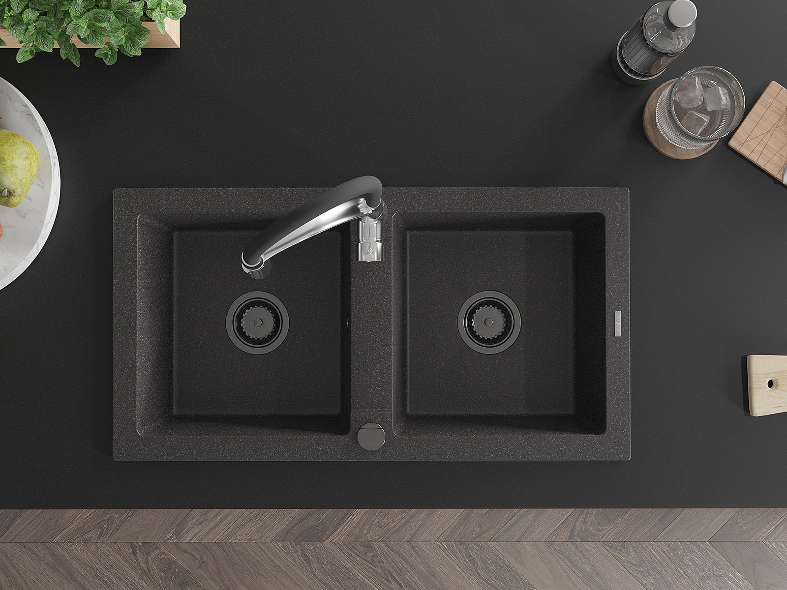 Mexen Mario granitinis dviejų skyrių plautuvė su virtuviniu maišytuvu Aster, juodas taškuotas - 6504-76-73450-07-B