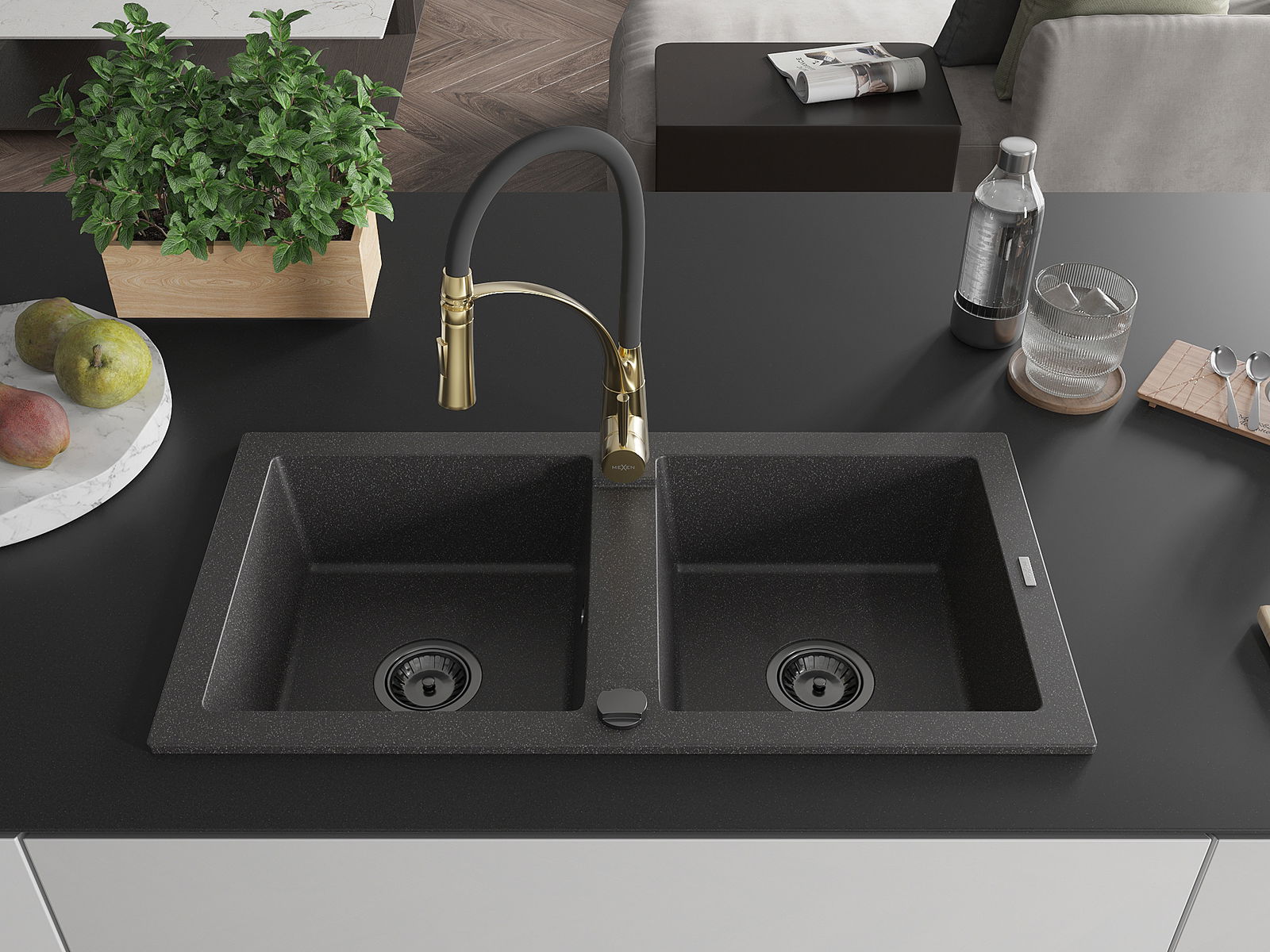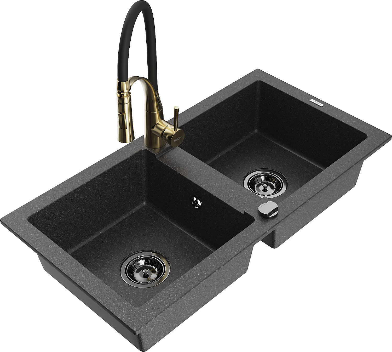 Mexen Mario granitinis 2-jų kamerų plautuvė su virtuviniu maišytuvu Aster, juodas taškuotas - 6504-76-73450-57-B