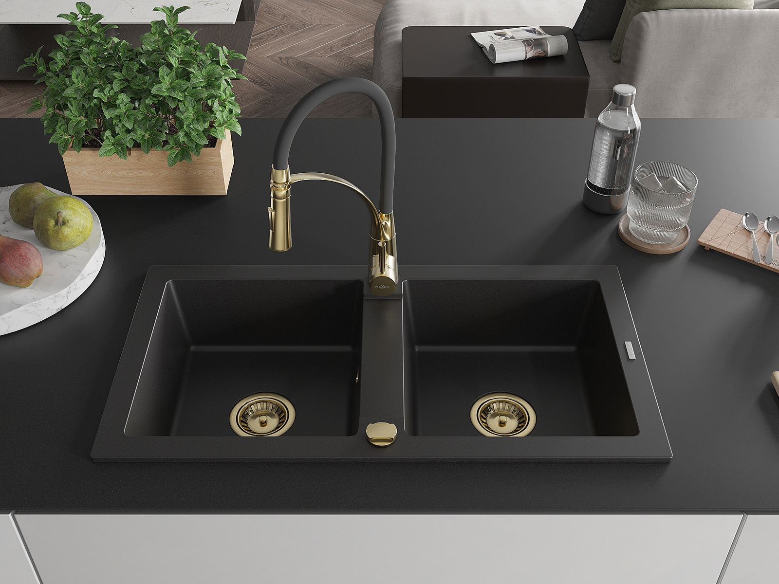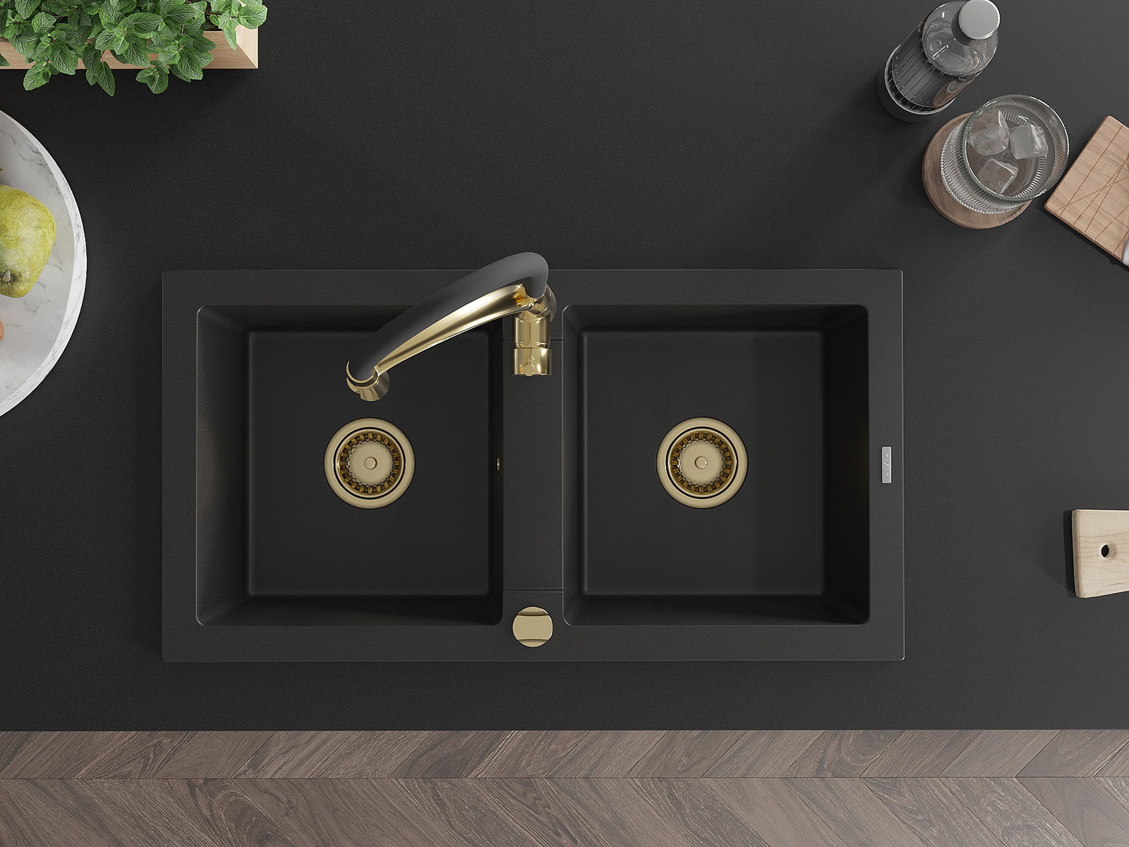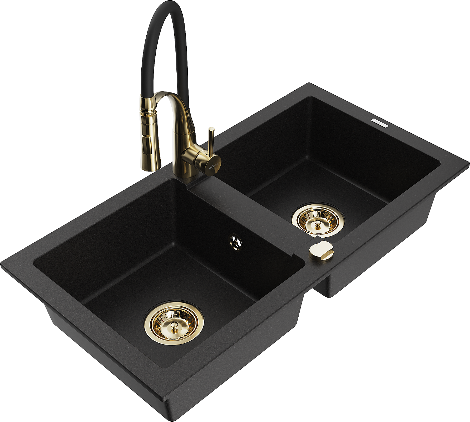 Mexen Mario granitinė dviejų skyrių kriauklė su virtuviniu čiaupu Aster, juoda - 6504-77-73450-57-G