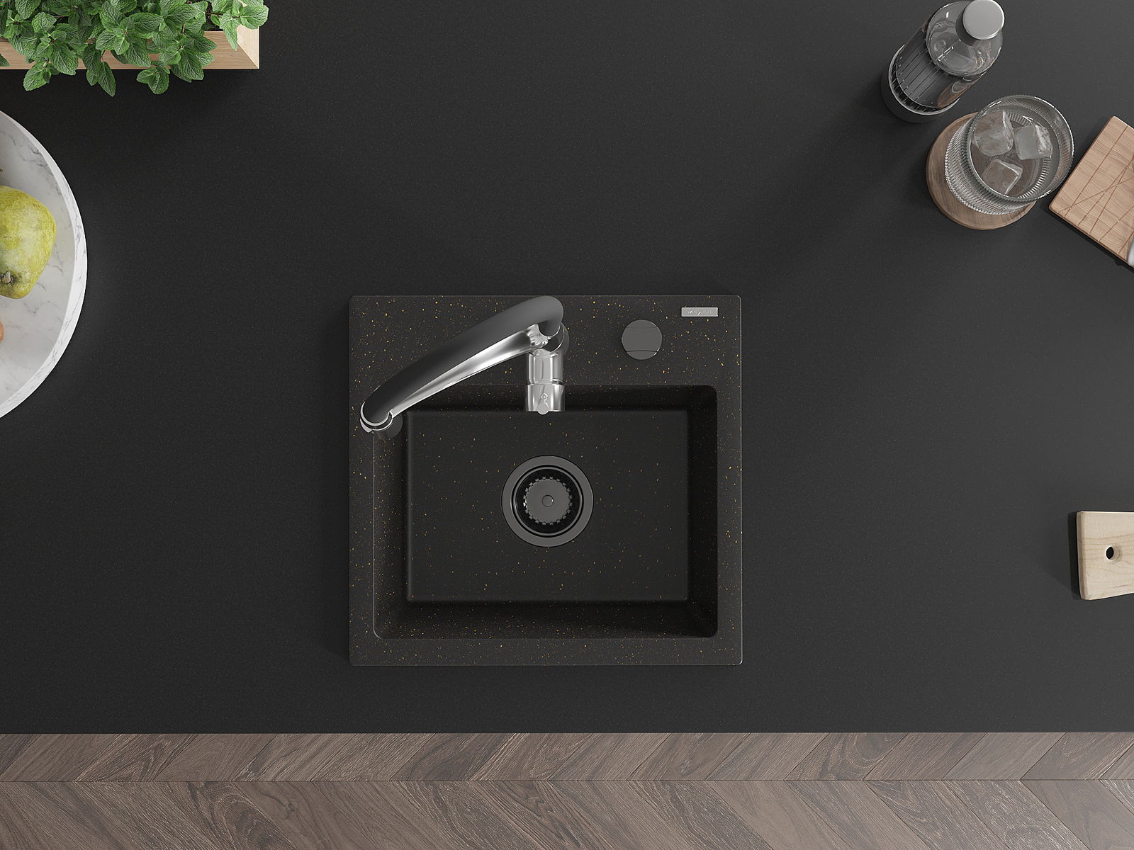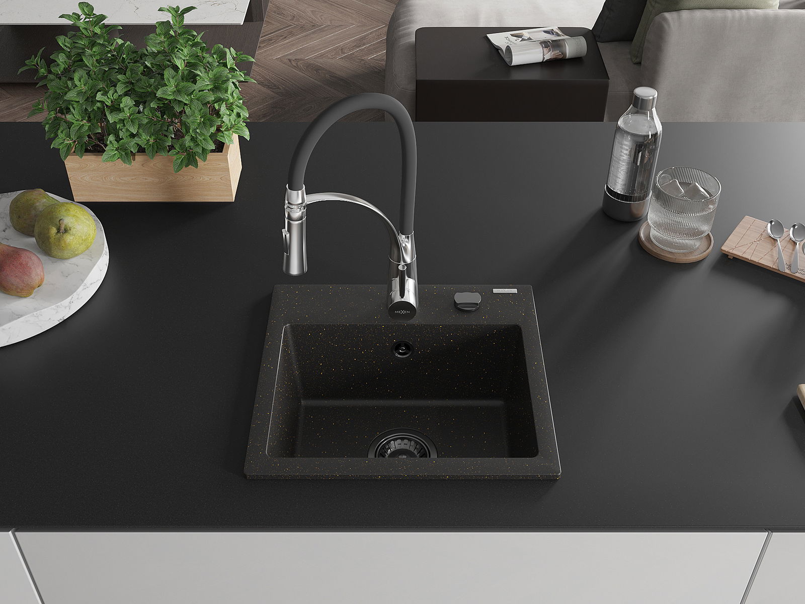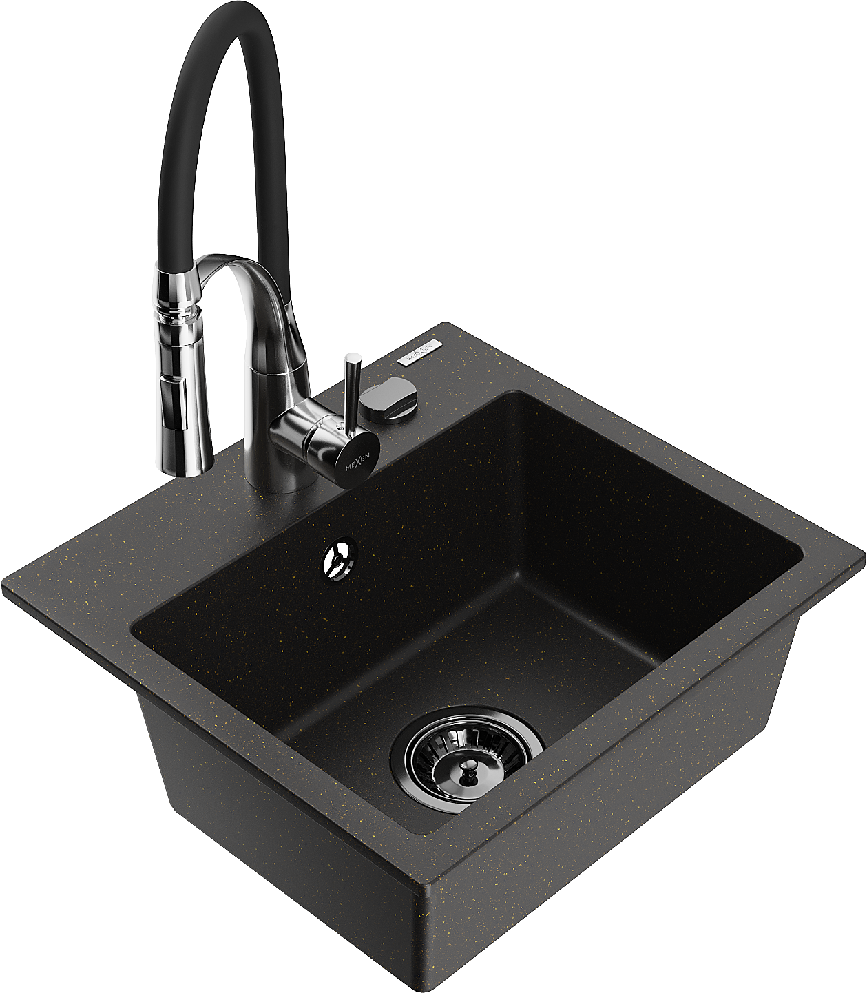 Mexen Milo vienos kameros granitinė plautuvė su virtuviniu maišytuvu Aster, juoda/auksinė metalikos - 6505-75-73450-07-B