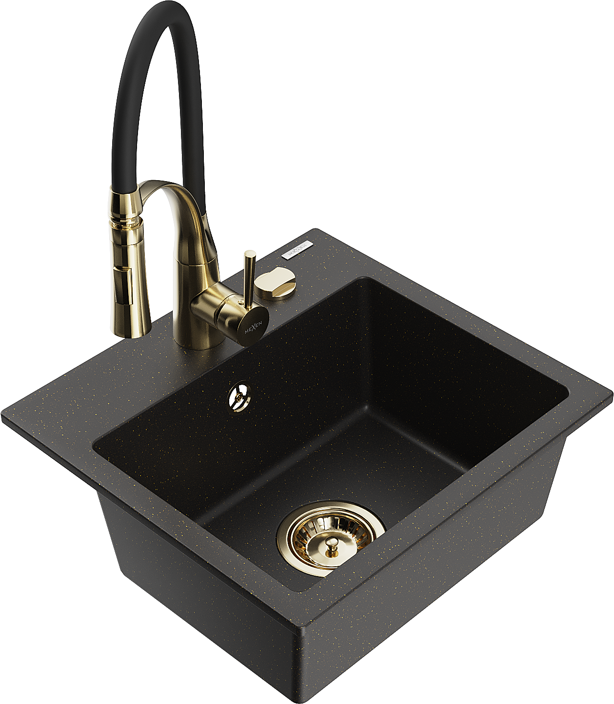 Mexen Milo granito virtuvės plautuvė su Aster virtuviniu maišytuvu, juoda/auksinė metalo spalva - 6505-75-73450-57-G