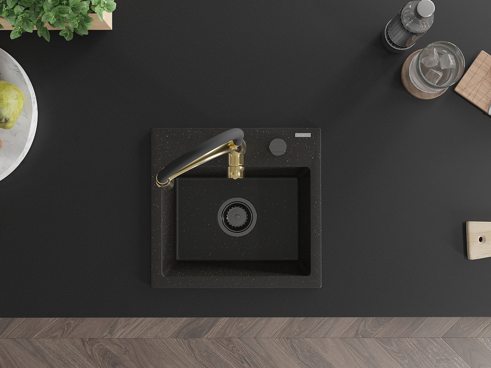 Mexen Milo granitinis vienos kameros plautuvas su virtuviniu maišytuvu Aster, juodas/auksinis metalikas - 6505-75-73450-57-B