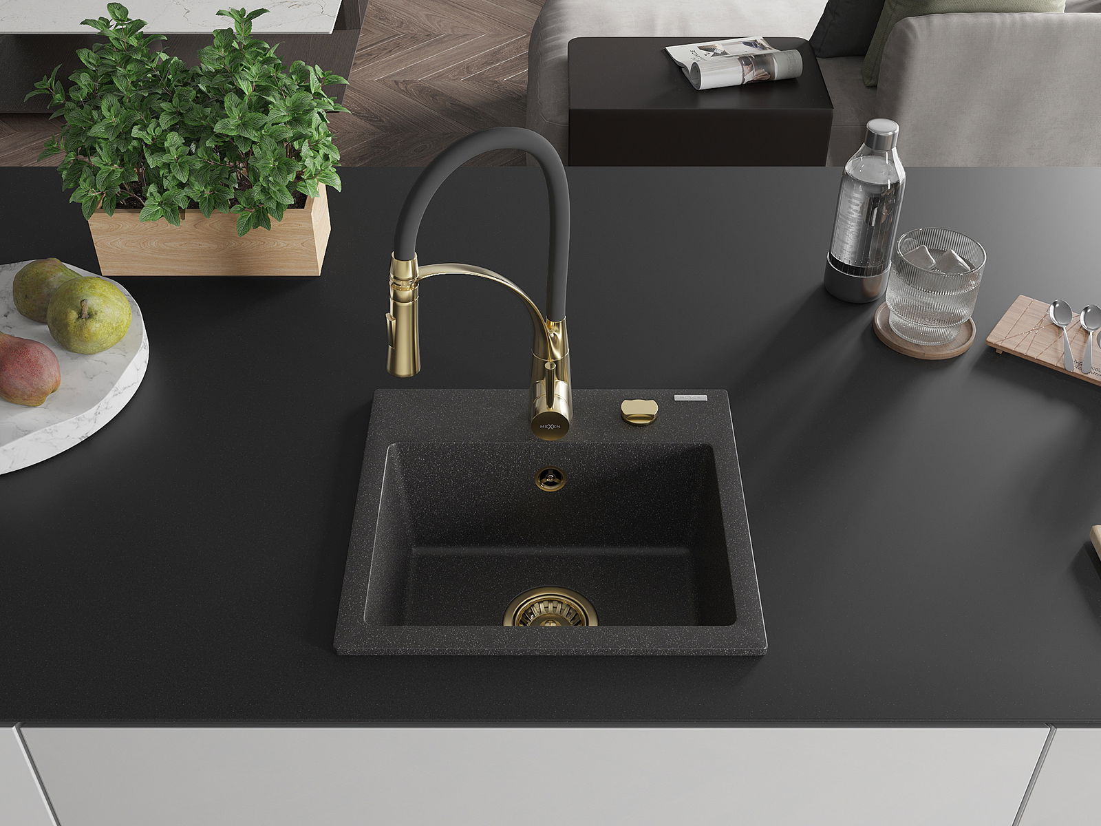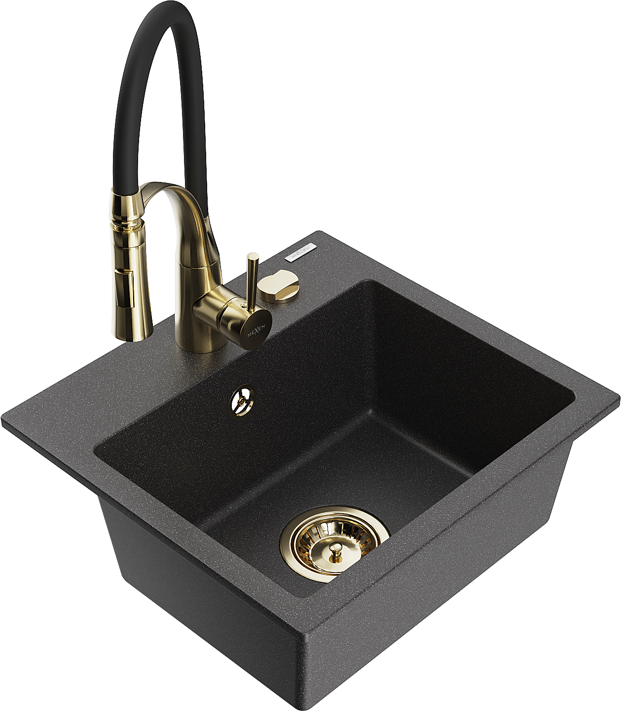 Mexen Milo granitinė plautuvė 1-skyrių su virtuvės maišytuvu Aster, juoda dėmelėta - 6505-76-73450-57-G