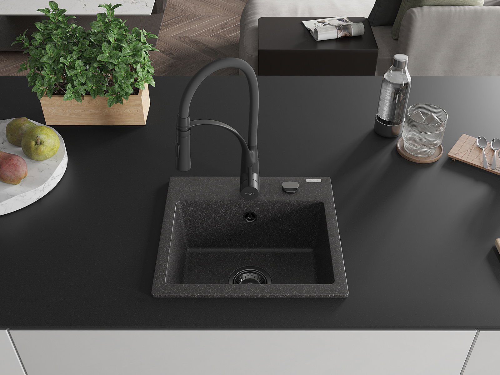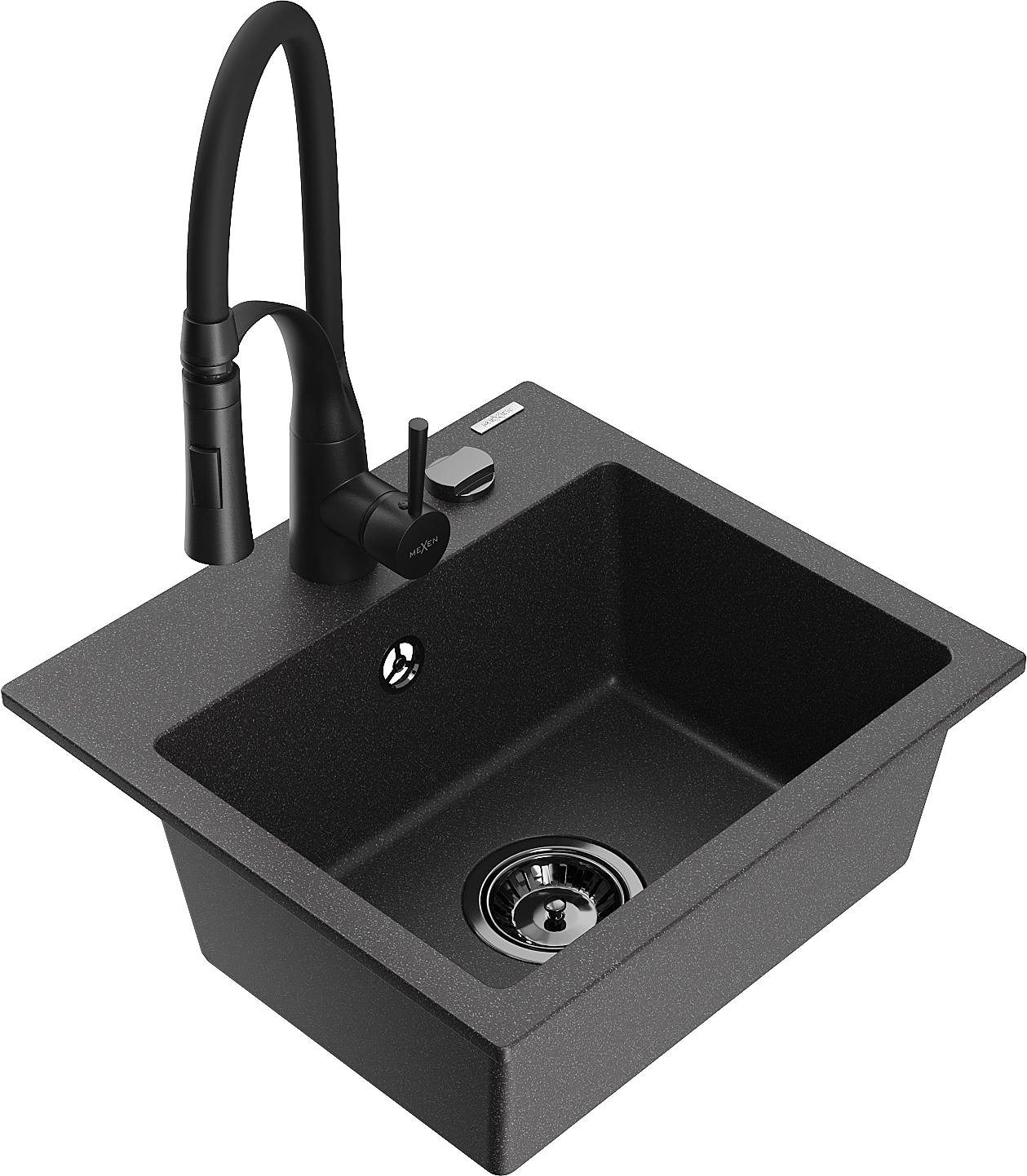Mexen Milo granitinė virtuvės plautuvė su viena komora ir virtuviniu maišytuvu Aster, juodas taškuotas - 6505-76-73450-70-B