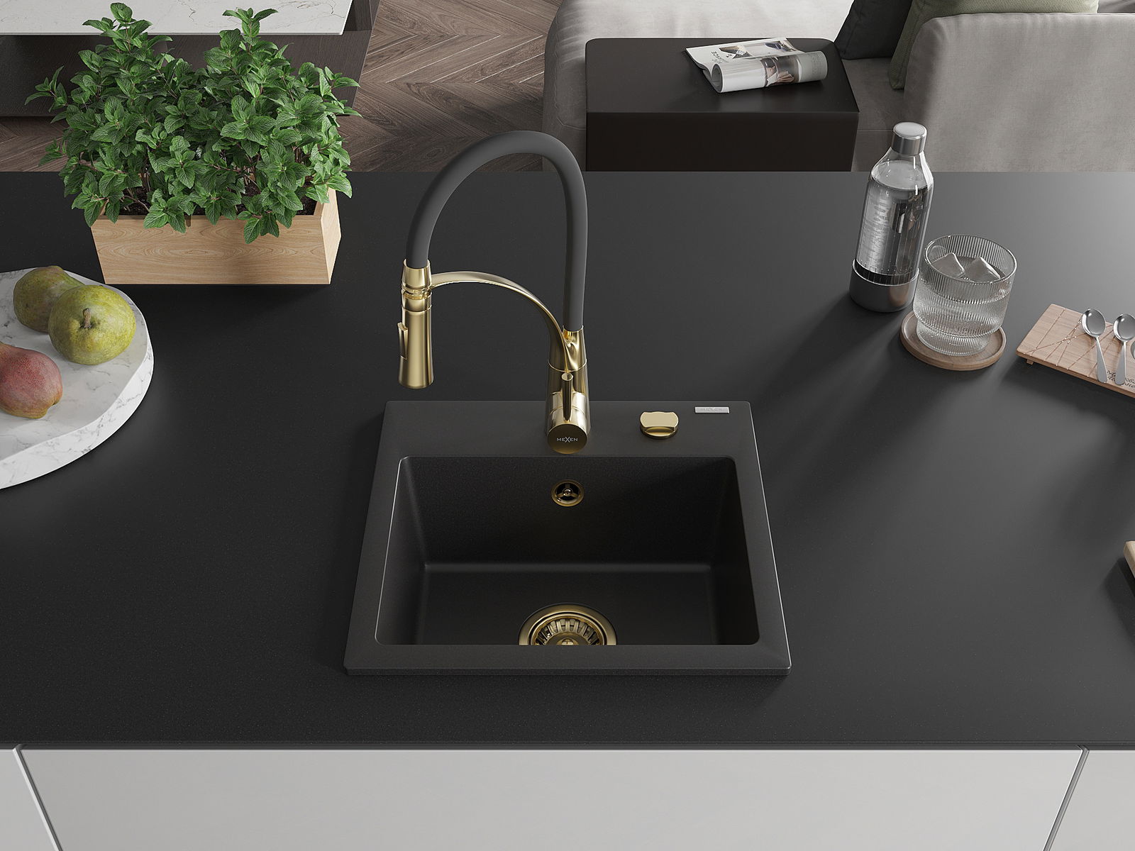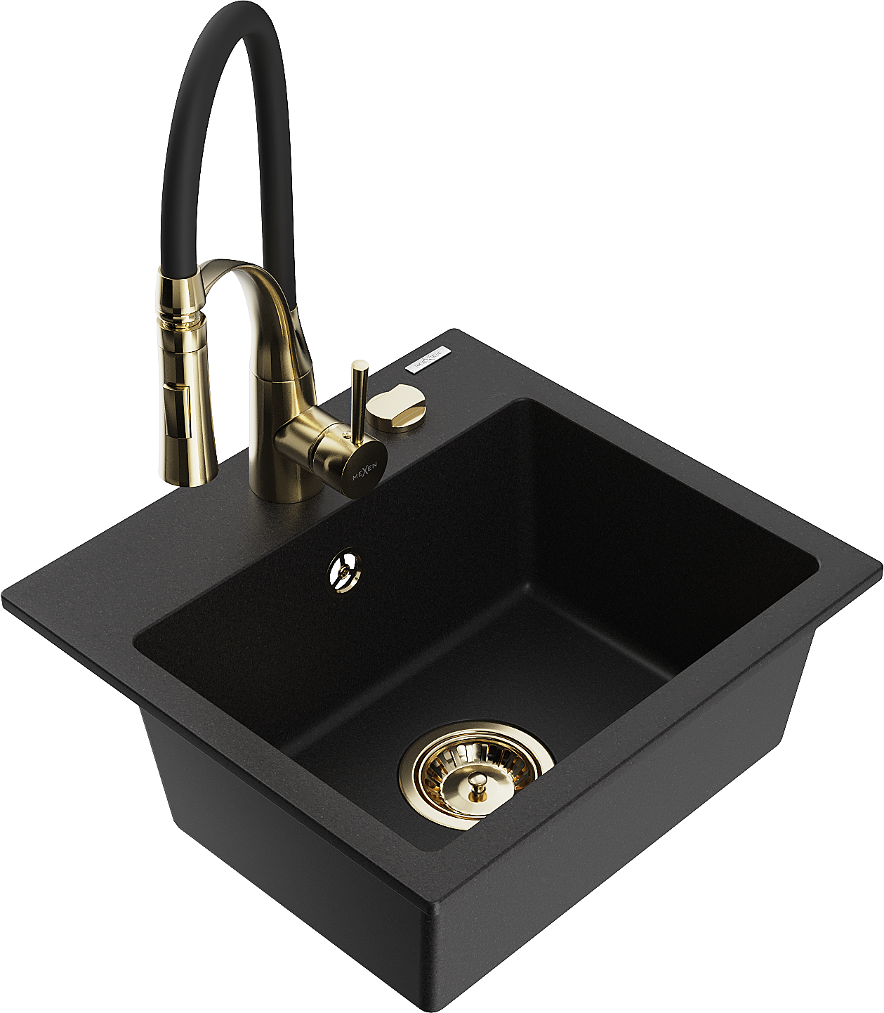 Mexen Milo granitinė virtuvės plautuvė su 1 dubeniu ir virtuviniu maišytuvu Aster, juoda - 6505-77-73450-57-G