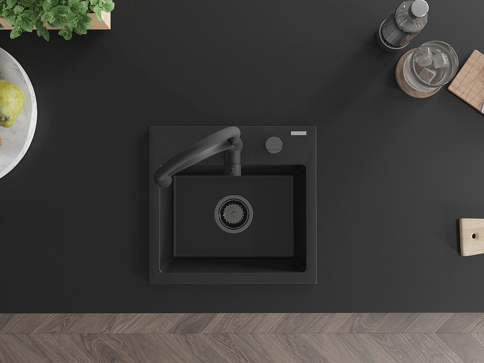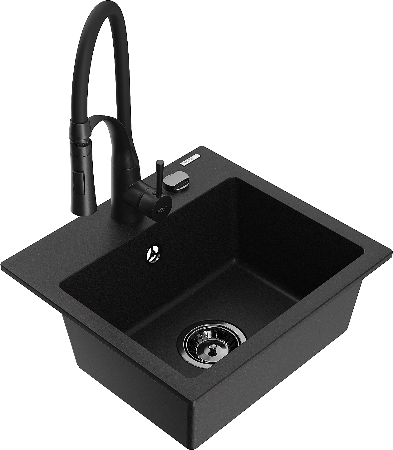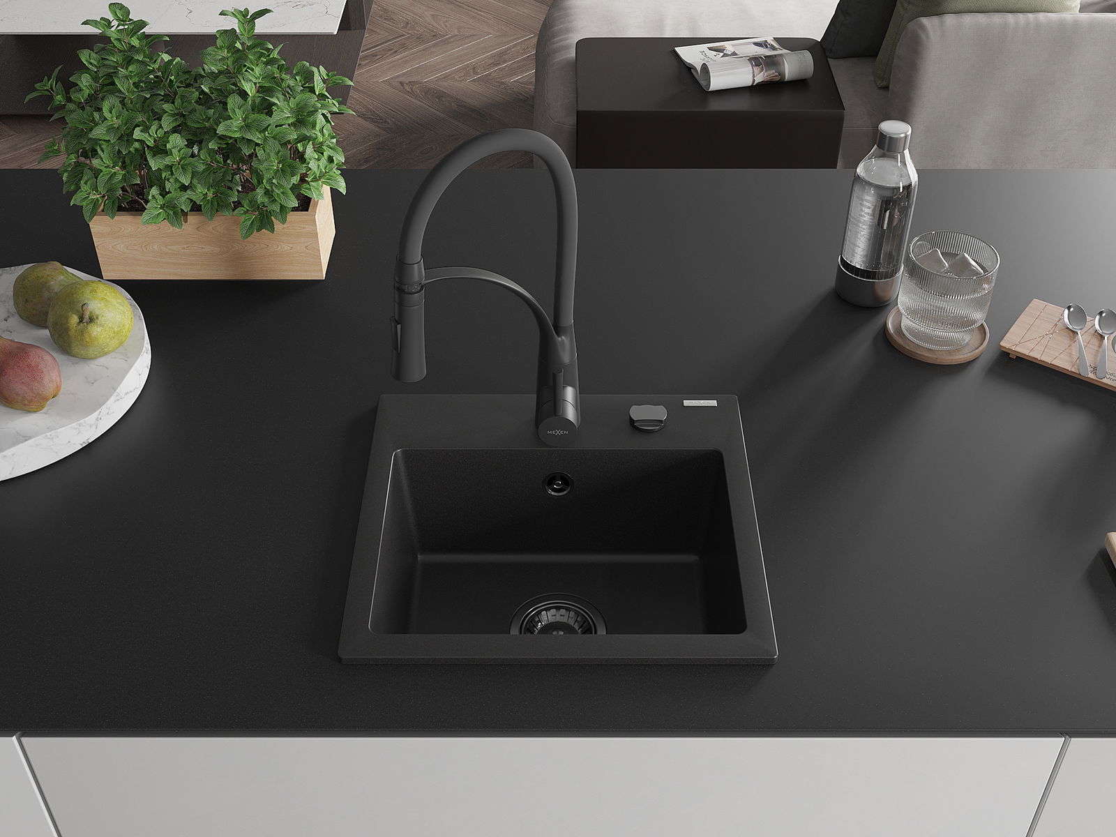Mexen Milo vientisas akmens virtuvės kriauklė, 1 skyrius, su virtuvės maišytuvu Aster, juoda - 6505-77-73450-70-B