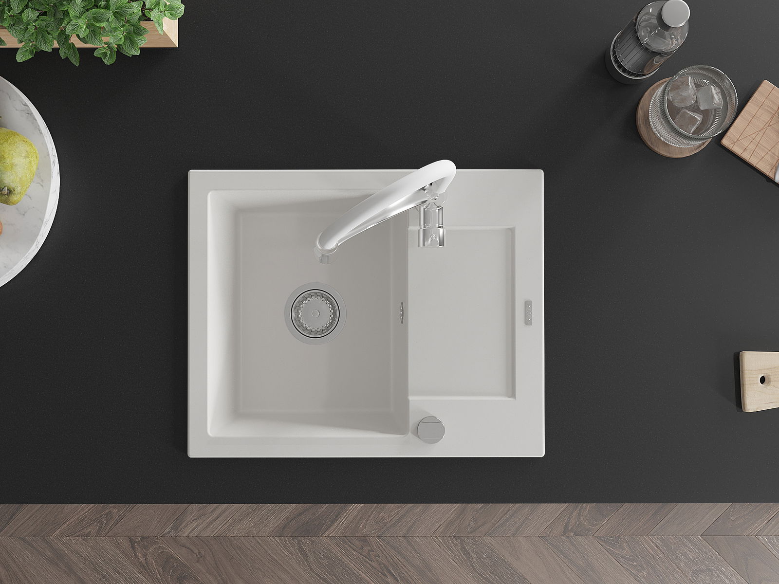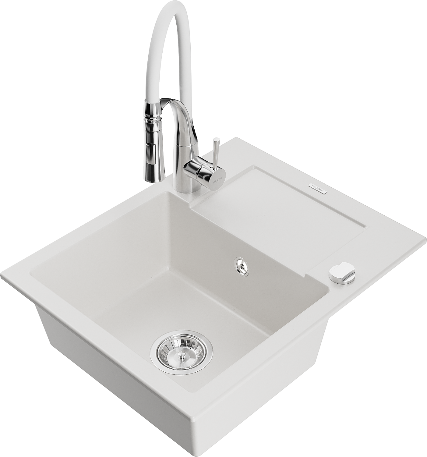 Mexen Enzo granito plautuvė su viena kamera ir nusausintuvu bei virtuvės maišytuvu Aster, balta - 6506-20-73450-02