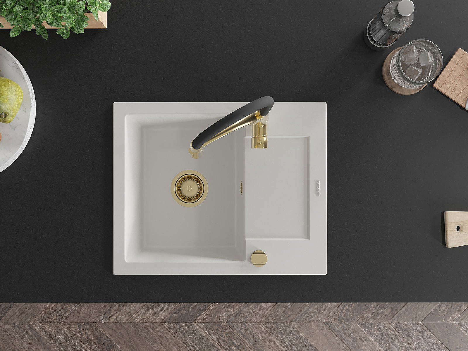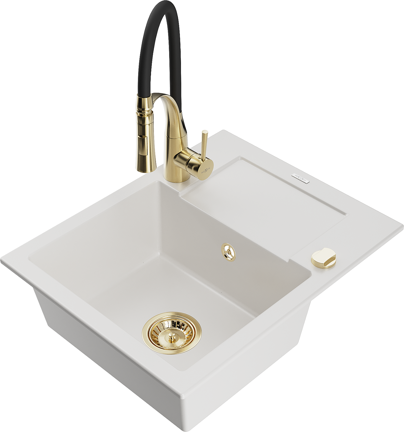 Mexen Enzo granito praustuvas 1 skyrius su nuvarvėjimo lentyna ir virtuviniu maišytuvu Aster, baltas - 6506-20-73450-57-G