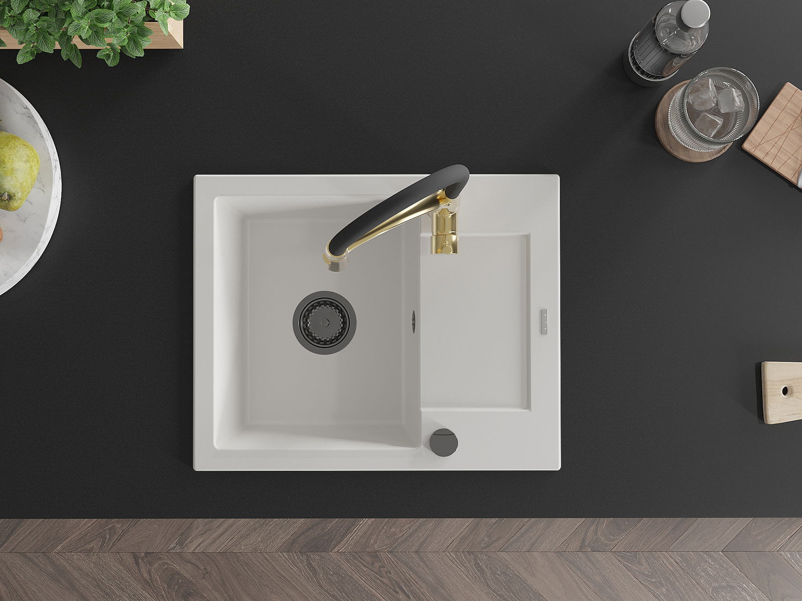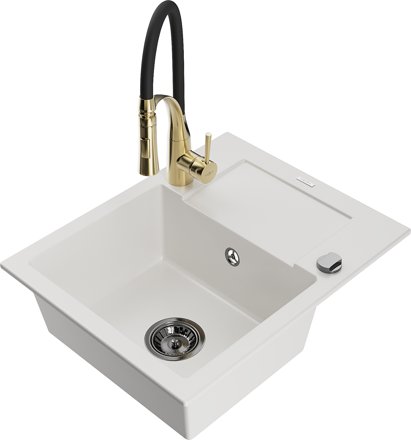 Mexen Enzo granitinis plautuvė vienkamerė su nubėgimu ir virtuviniu maišytuvu Aster, balta - 6506-20-73450-57-B