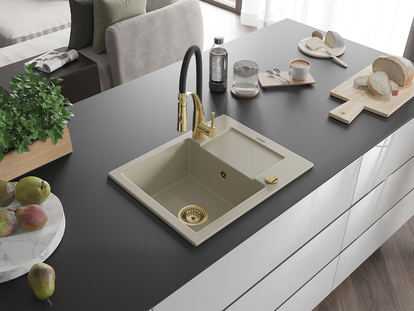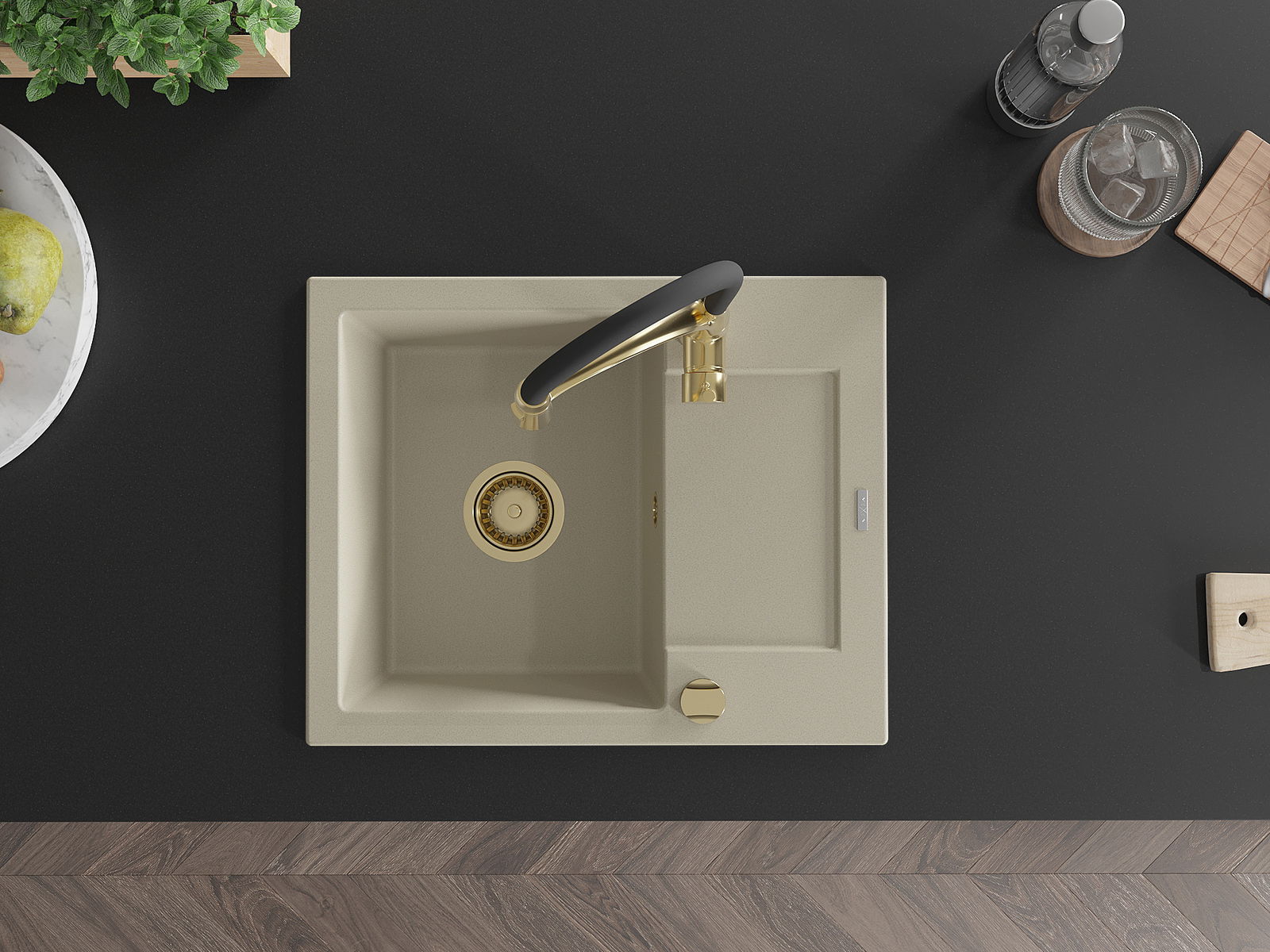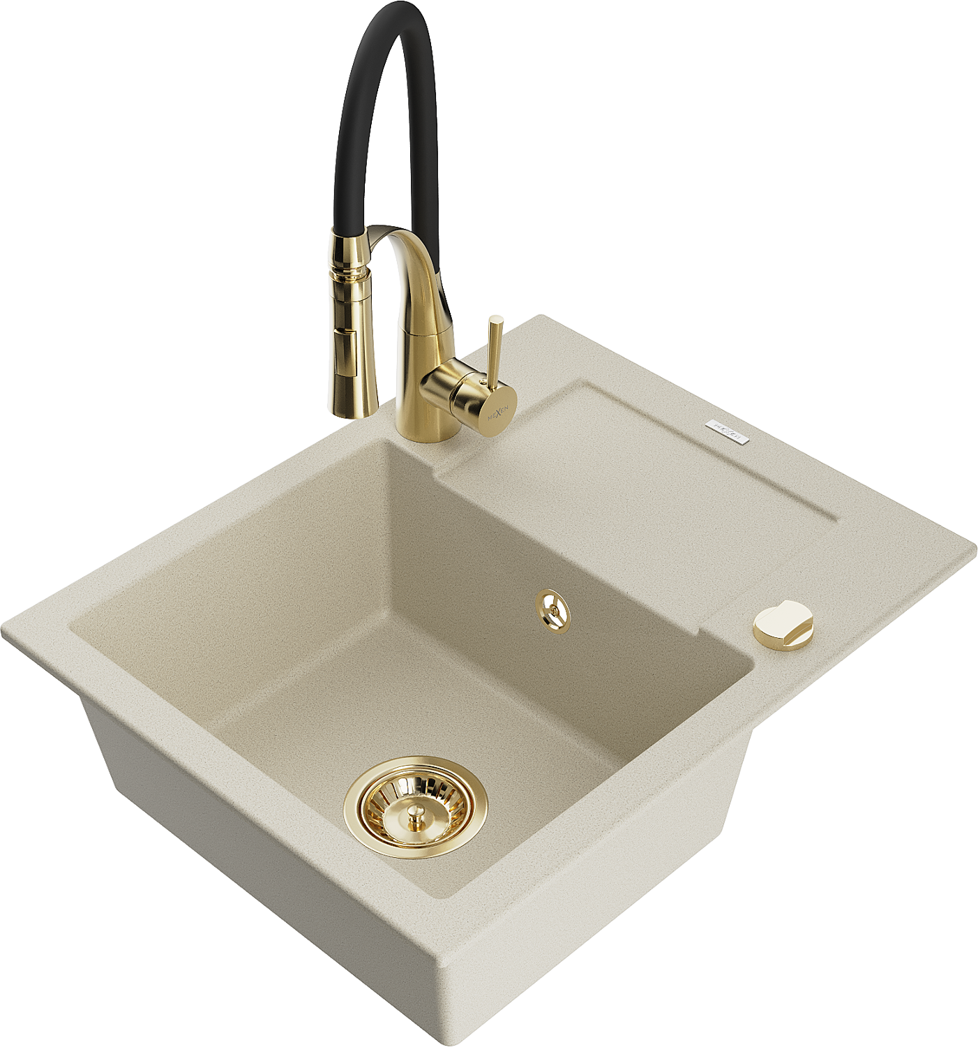 Mexen Enzo granito kriauklė su vienu dubeniu ir nusausinimu bei maišytuvu Aster, smėlio spalvos - 6506-69-73450-57-G