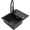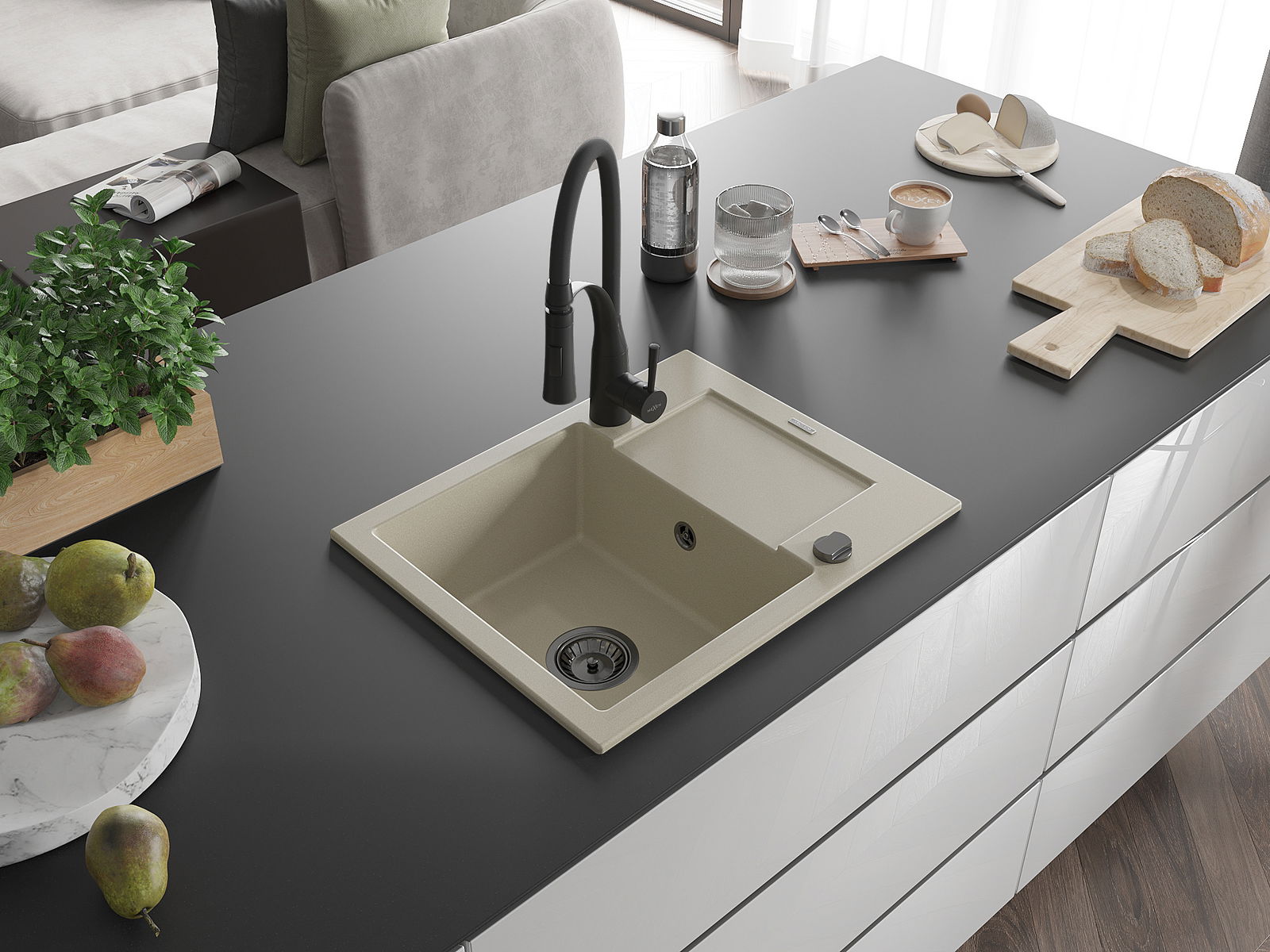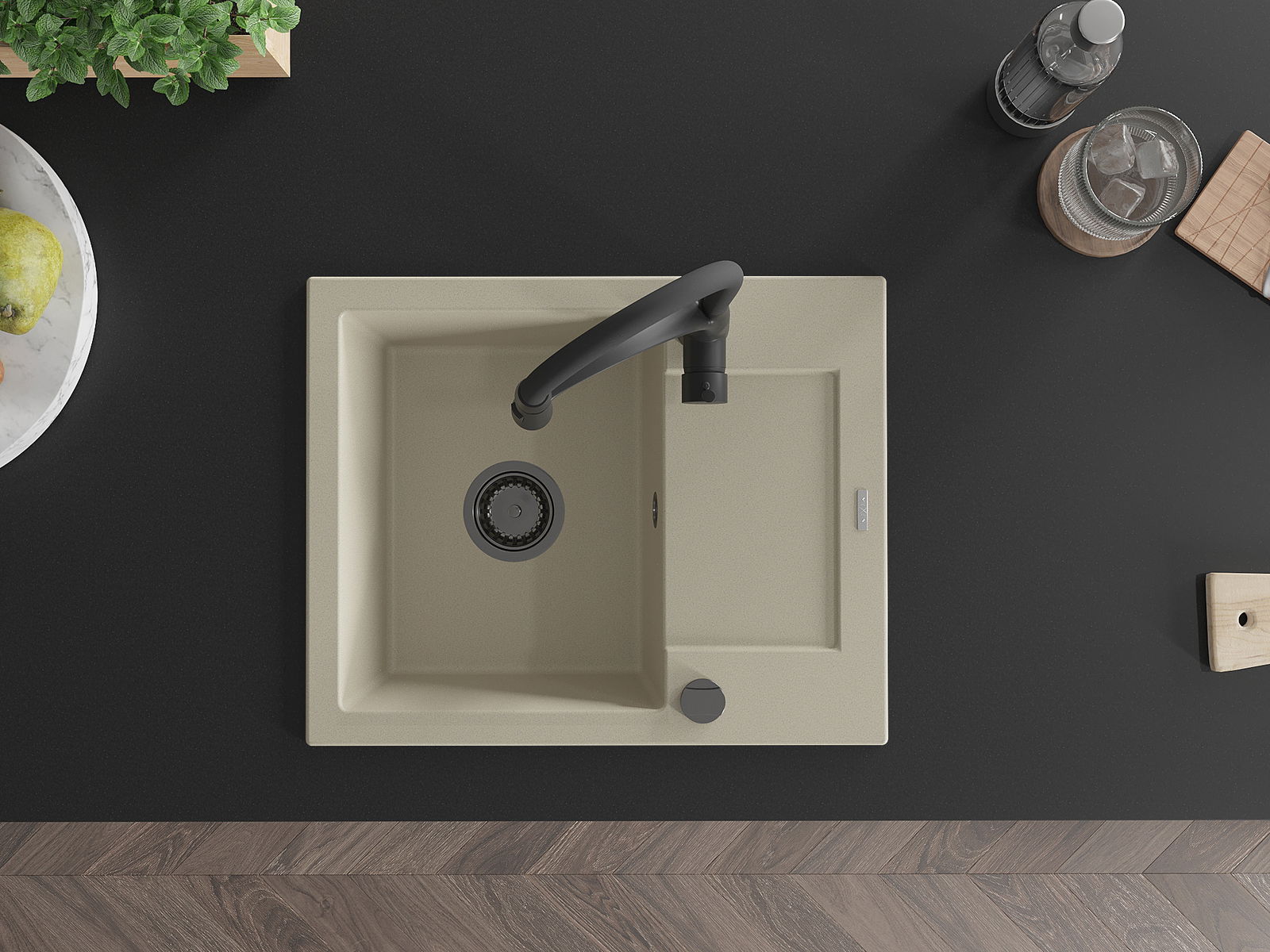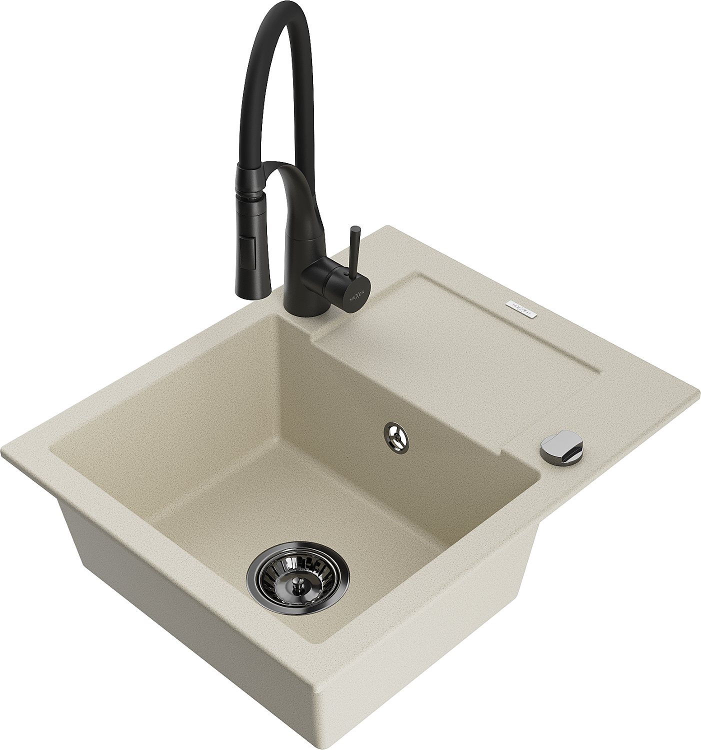 Mexen Enzo vienos kameros granitinė virtuvės kriauklė su nuvarveklomis ir virtuviniu maišytuvu Aster, smėlio spalvos
