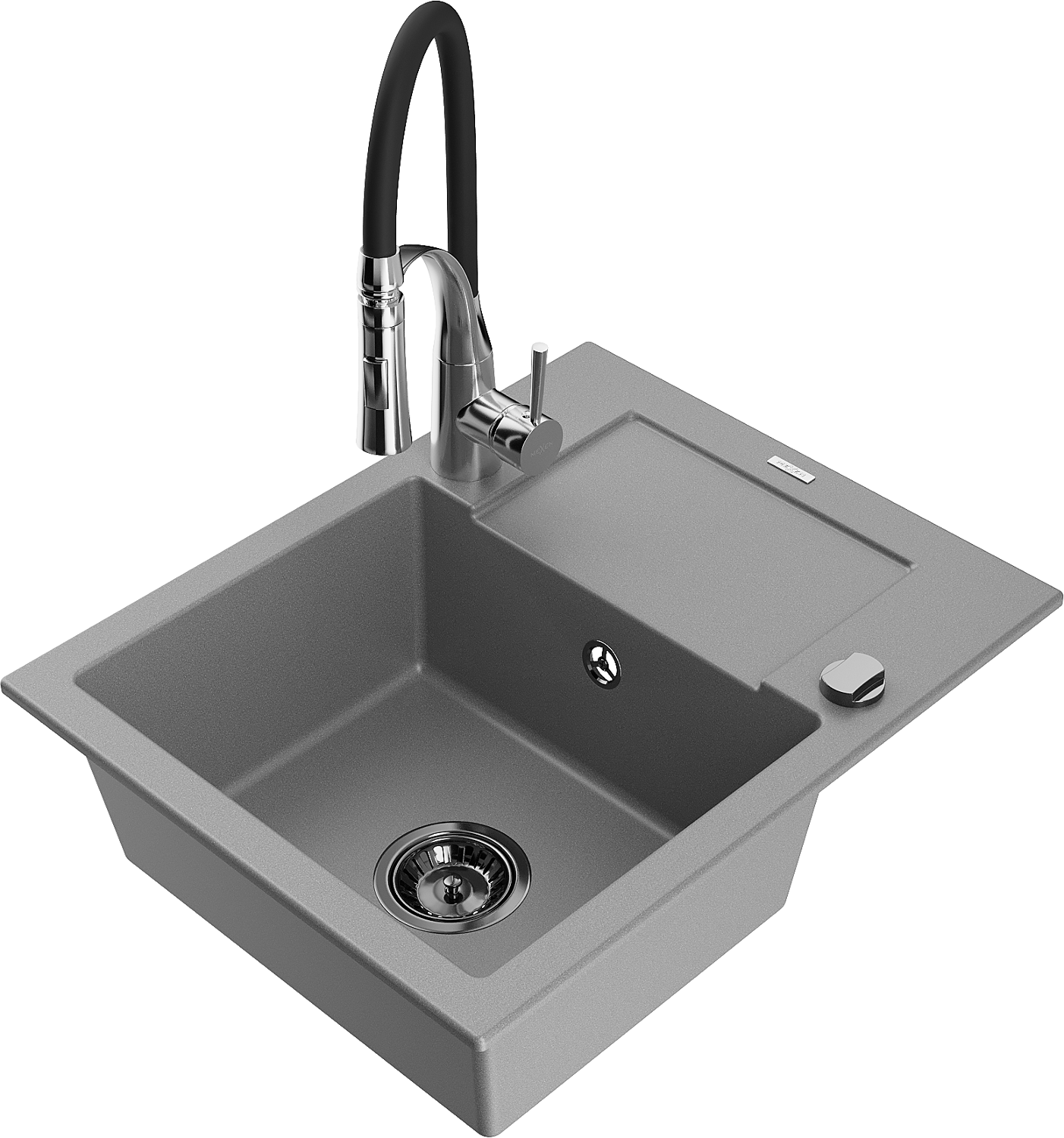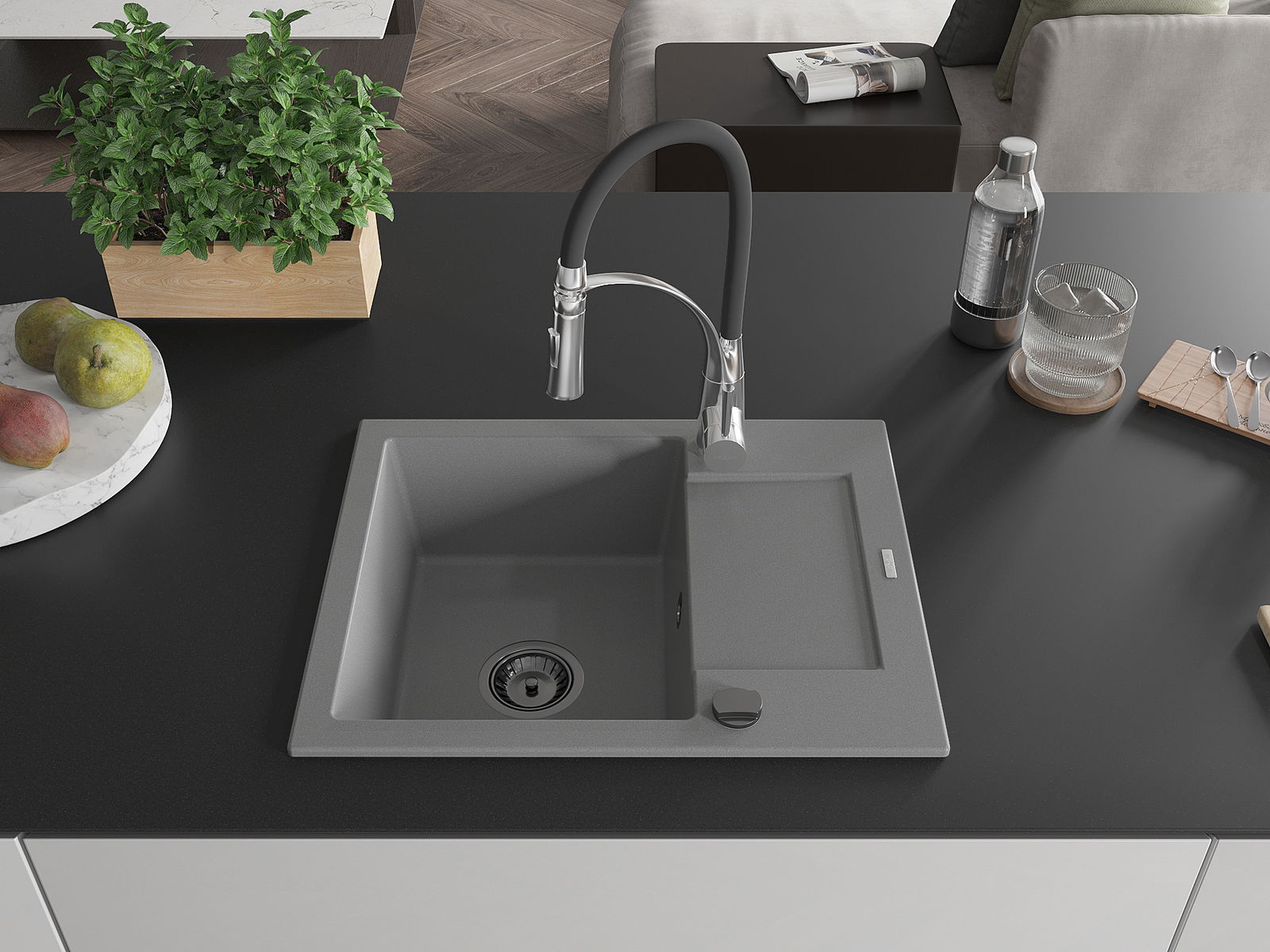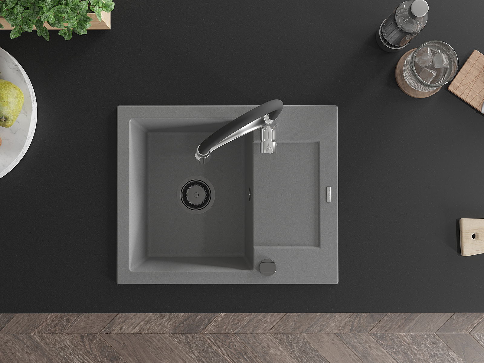 Mexen Enzo vienos plautuvės granito plautuvė su nutekamu ir virtuviniu maišytuvu Aster, pilka - 6506-71-73450-07-B