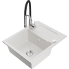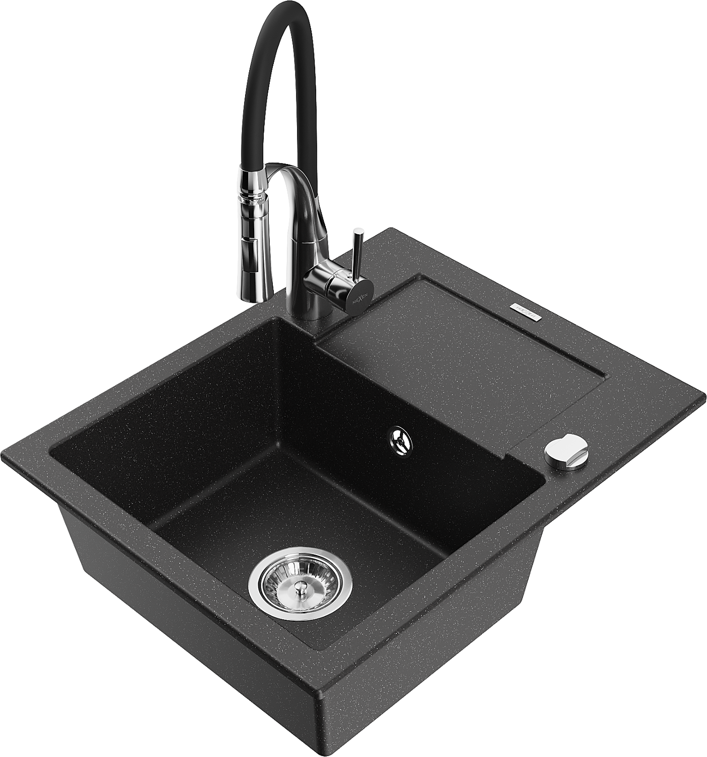 Mexen Enzo granitinė vienos kameros plautuvė su nuvarvėjimo vieta ir virtuviniu maišytuvu Aster, juoda/sidabrinė metalo