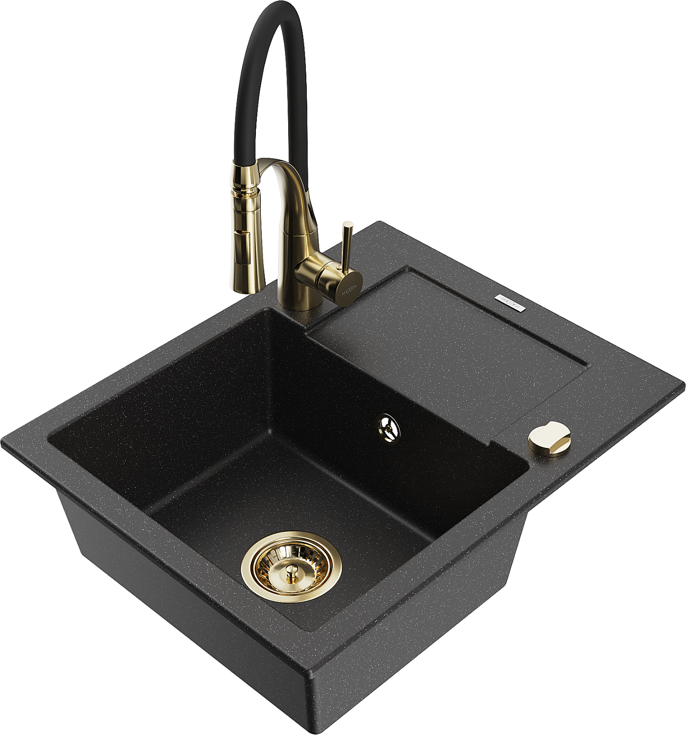 Mexen Enzo granitinis virtuvės plautuvės 1-skyrius su lašintuvu ir virtuviniu maišytuvu Aster, juodas/sidabrinis metalikas - 65?