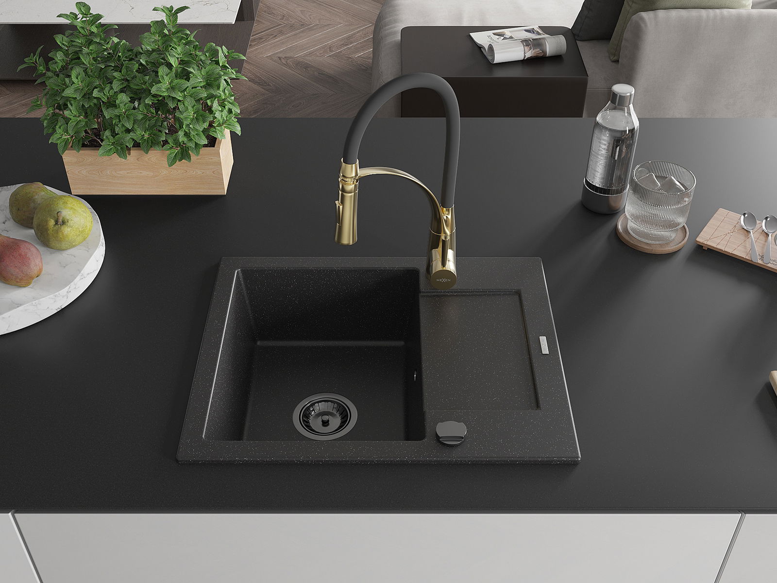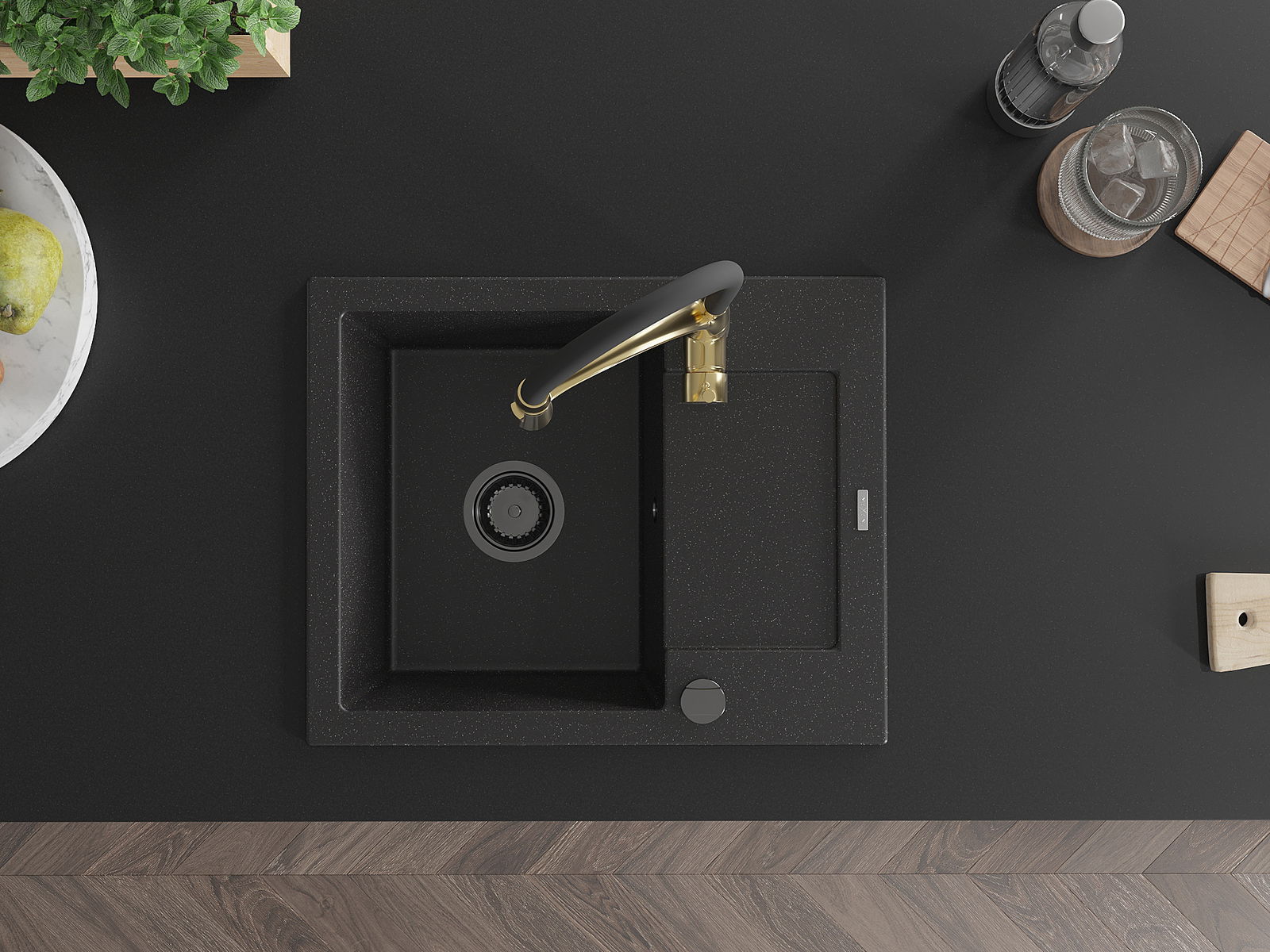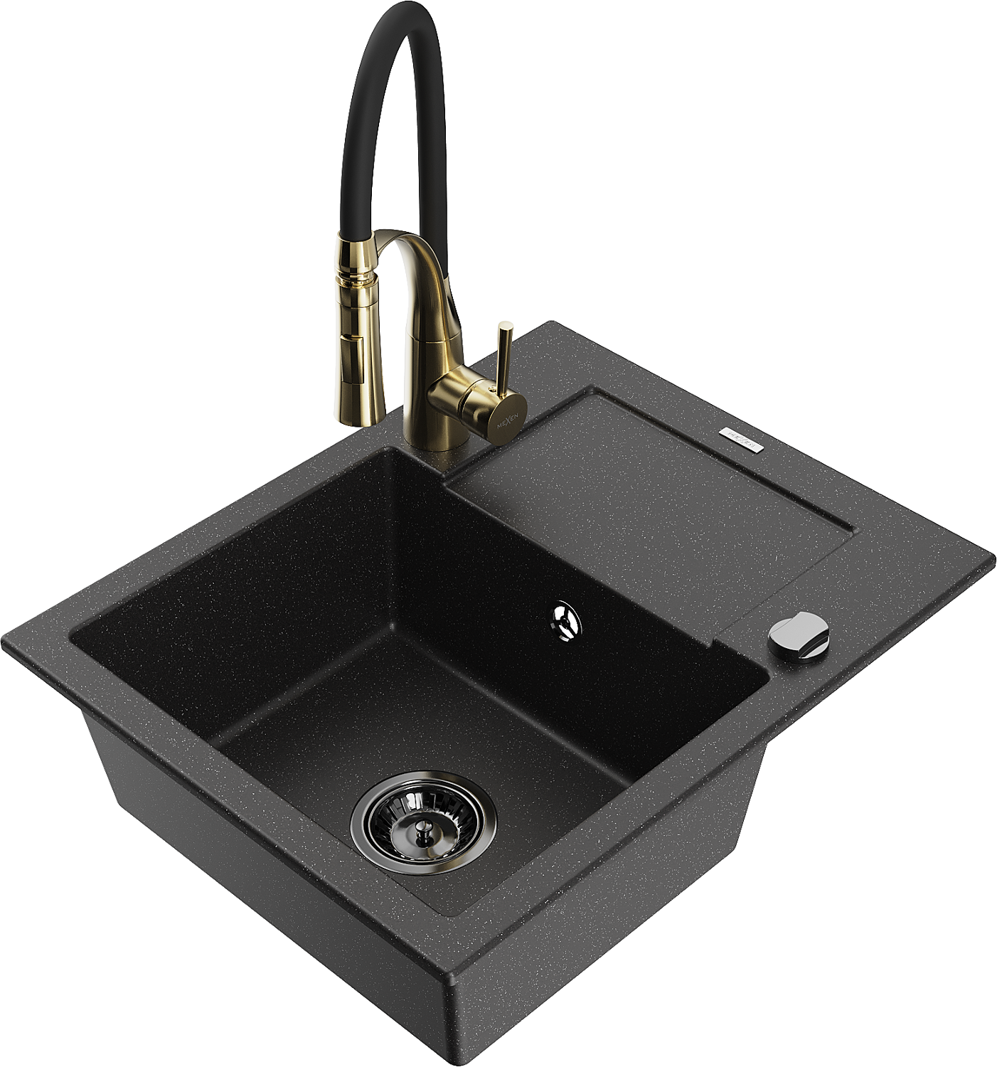 Mexen Enzo granitinė vienos kameros kriauklė su nutekėjimu ir virtuviniu maišytuvu Aster, juoda/sidabro metaliko spalva
