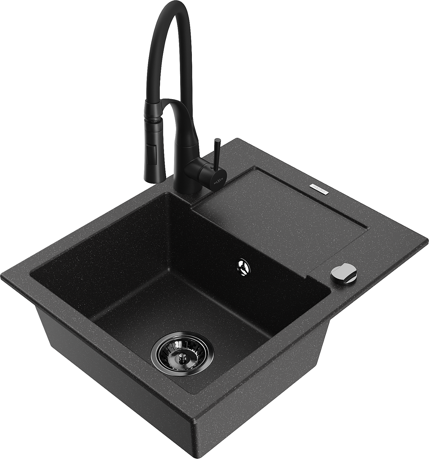 Mexen Enzo granitinė vienos kameros plautuvė su nutekėjimu ir virtuviniu maišytuvu Aster, juodas/sidabrinis metalikas - 6506-73?