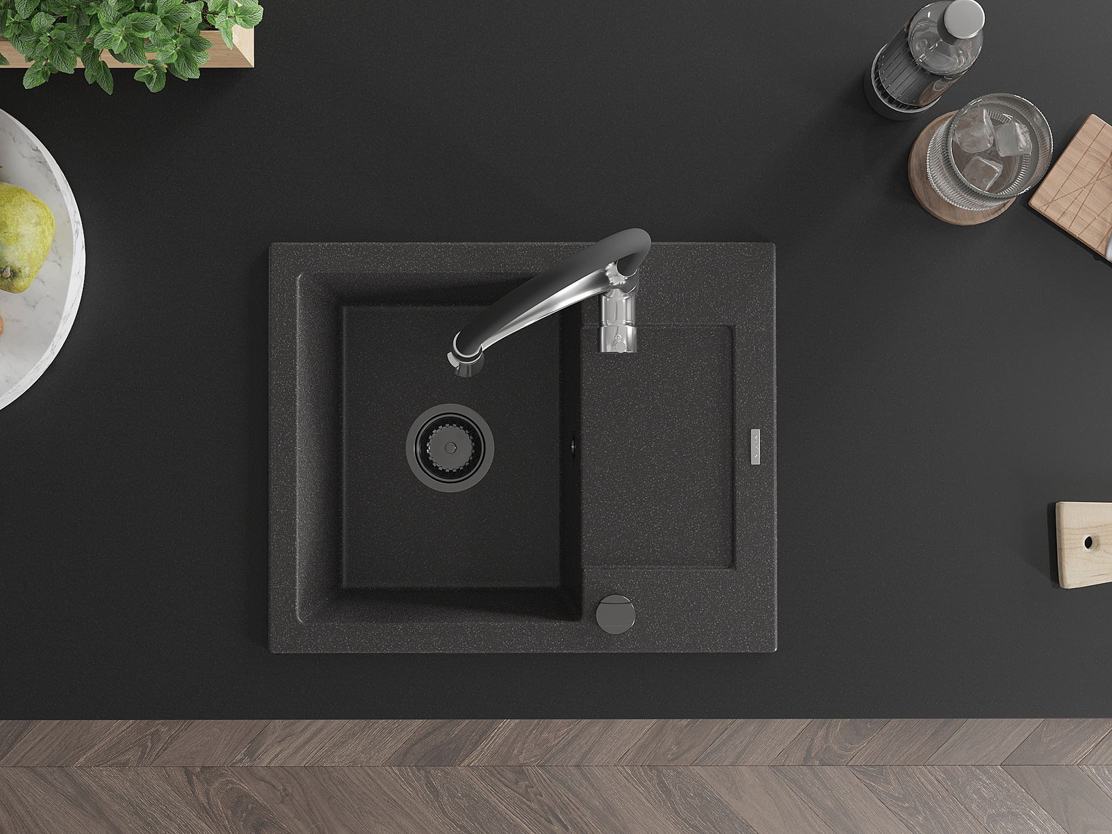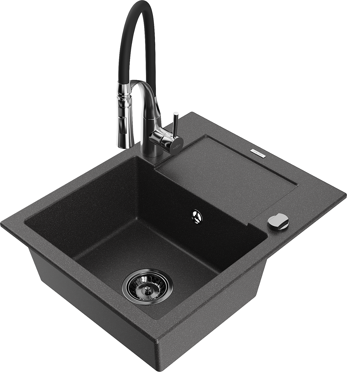 Mexen Enzo granitinė vienos plautuvės plautuvė su nutekėjimu ir virtuviniu maišytuvu Aster, juoda dėmėta