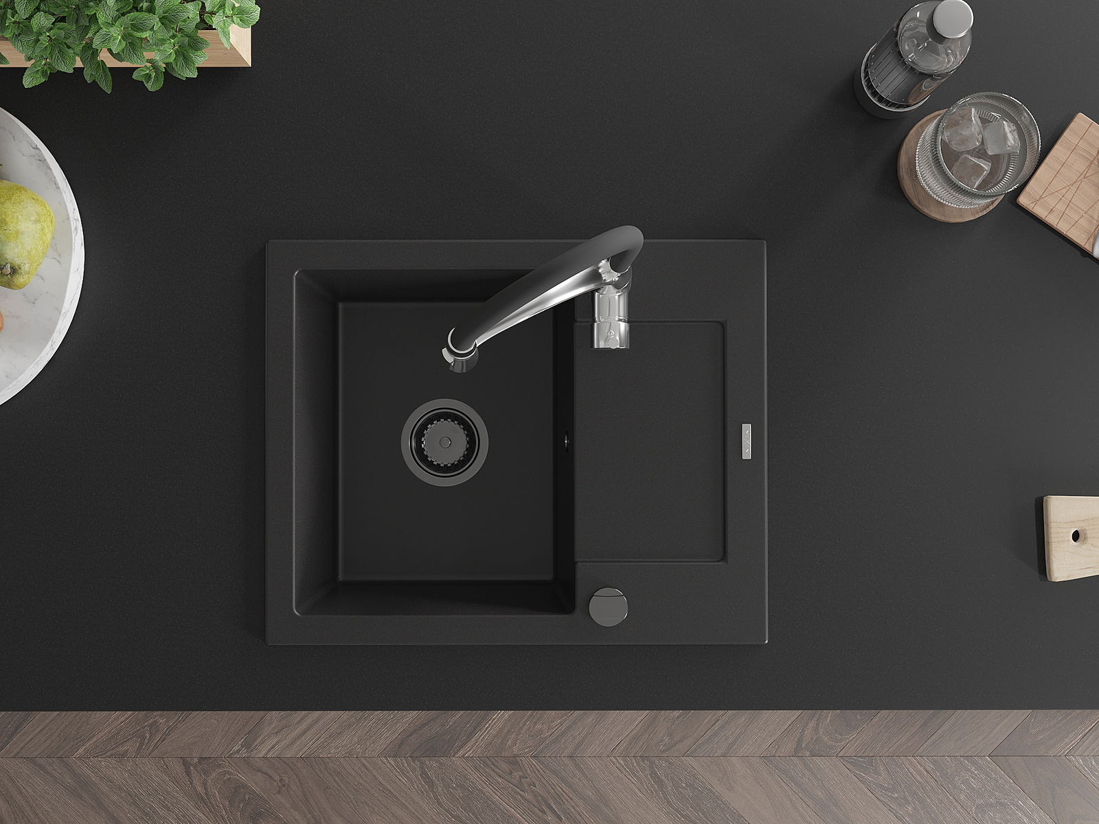 Mexen Enzo 1 skyrius granitinė virtuvės kriauklė su nusausintuvu ir Aster virtuviniu maišytuvu, juoda - 6506-77-73450-07-B