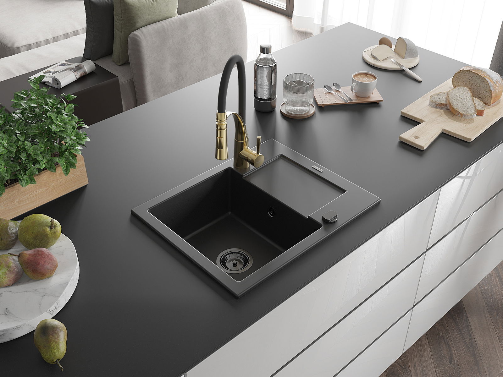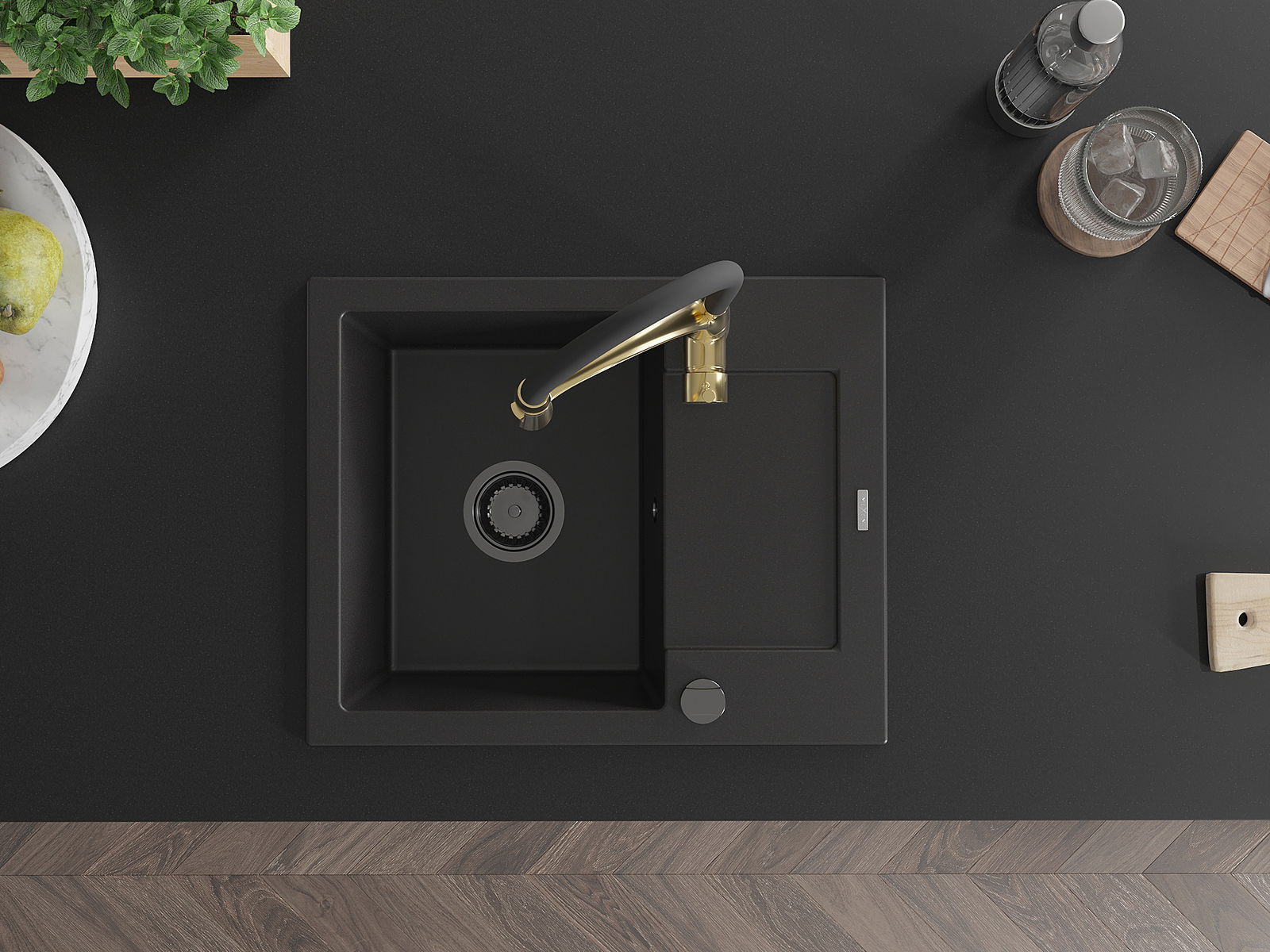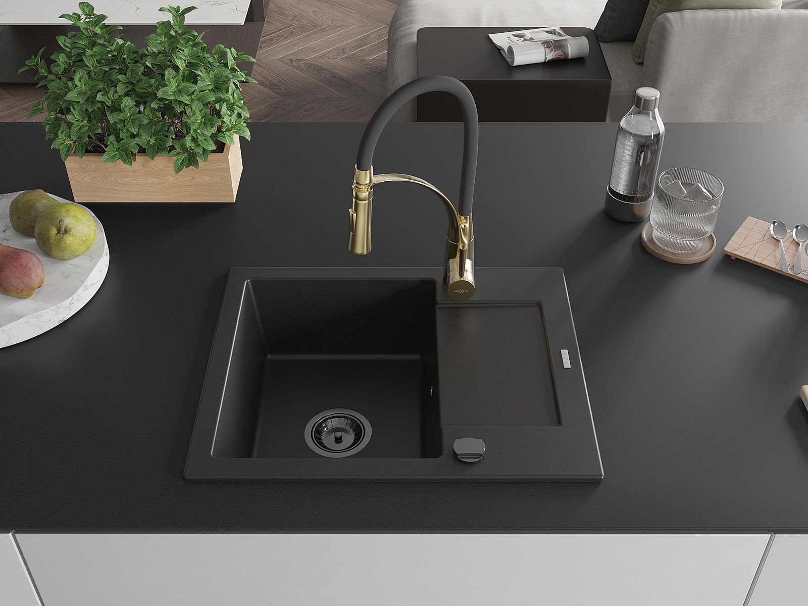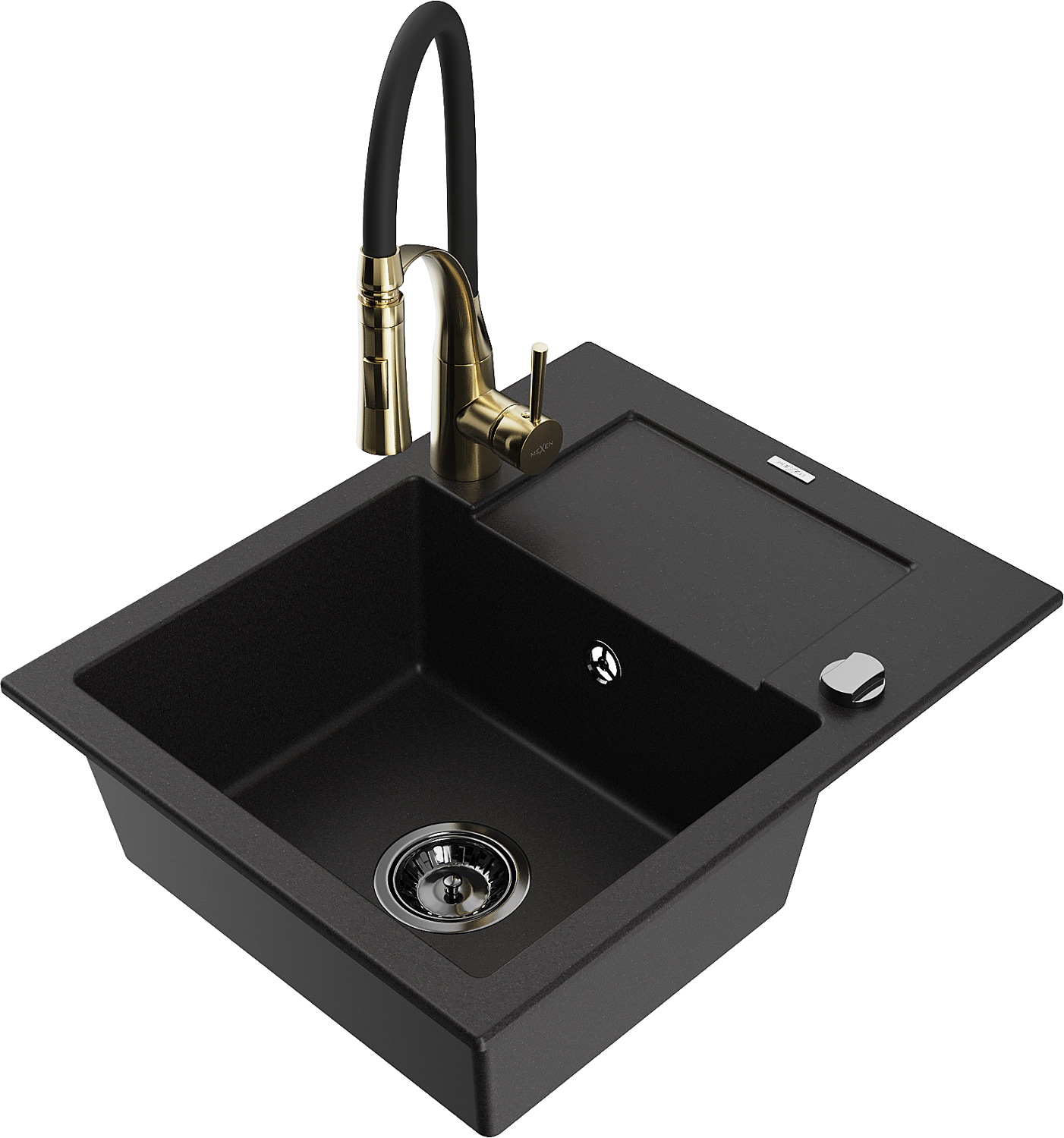 Mexen Enzo 1-dalių granitinė plautuvė su nusausintoju ir virtuviniu maišytuvu Aster, juoda - 6506-77-73450-57-B