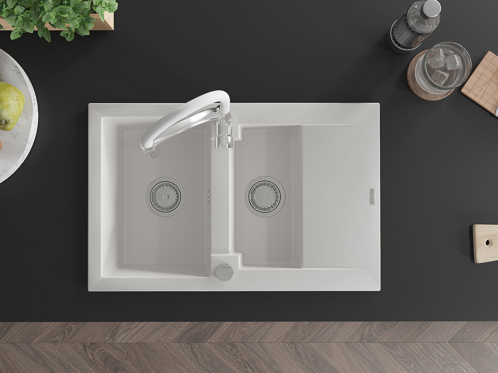 Mexen Gaspar granito plautuvė 1,5 kameros su lašėtuvu ir virtuviniu maišytuvu Aster, balta - 6507-20-73450-02