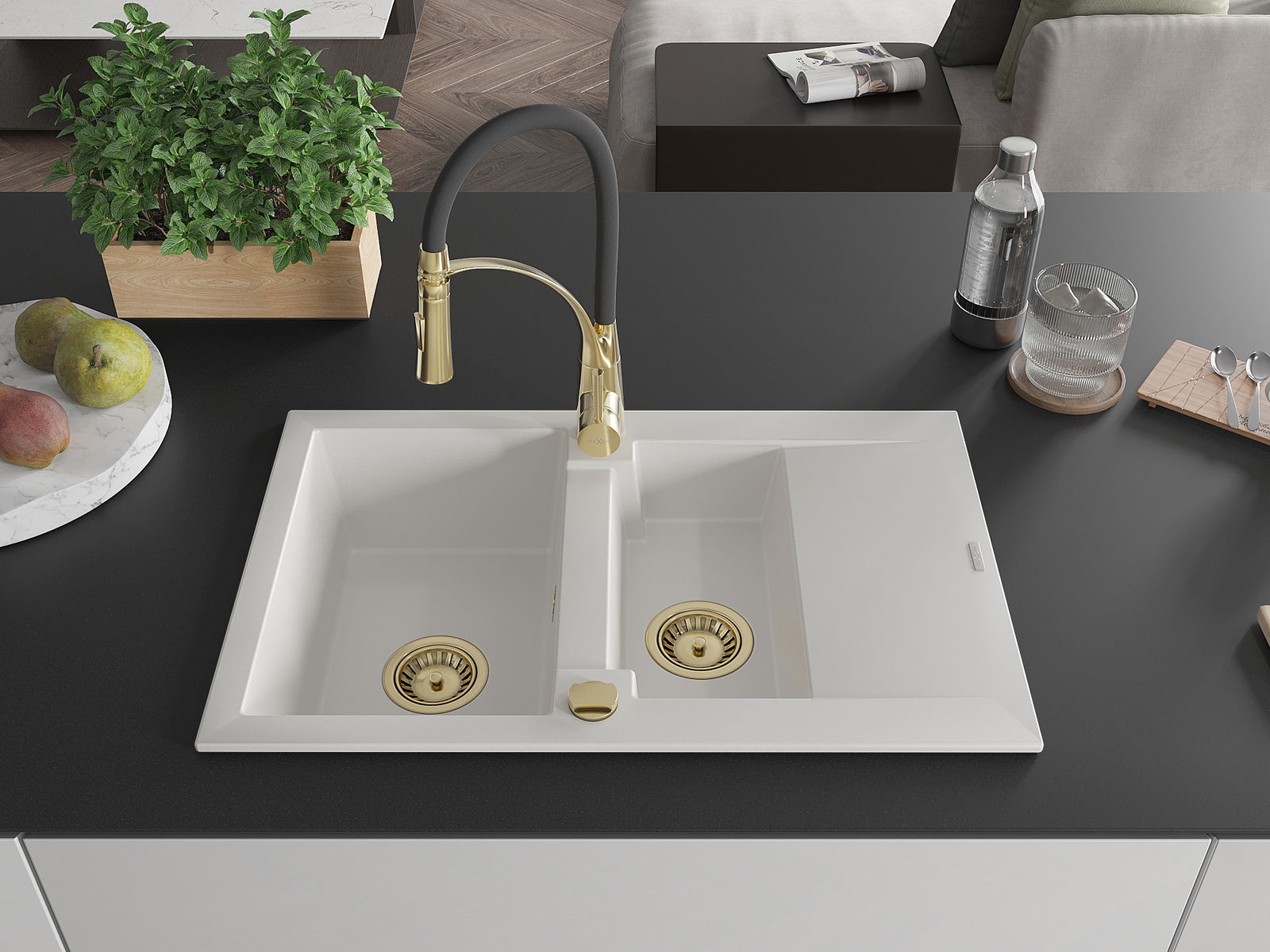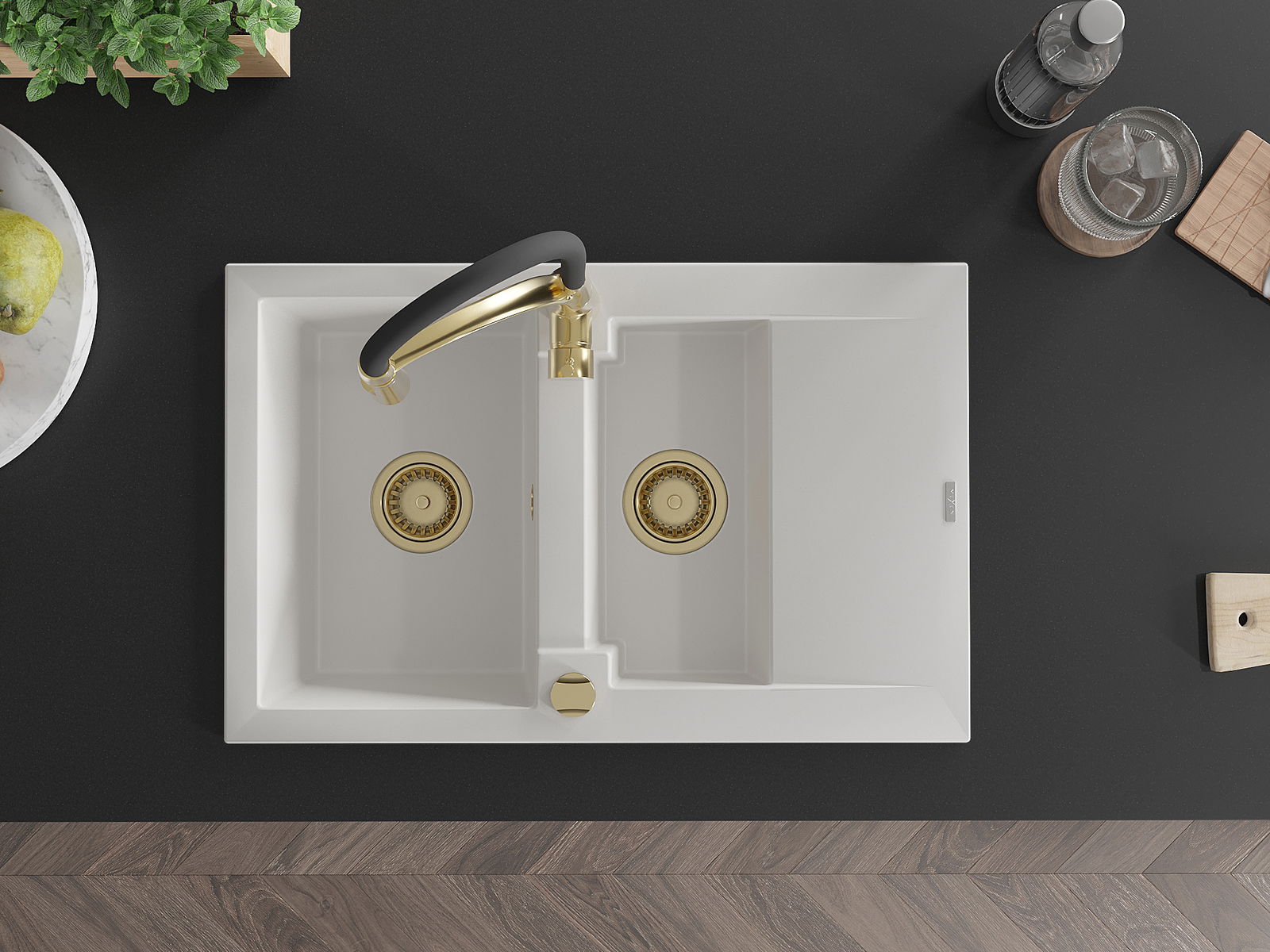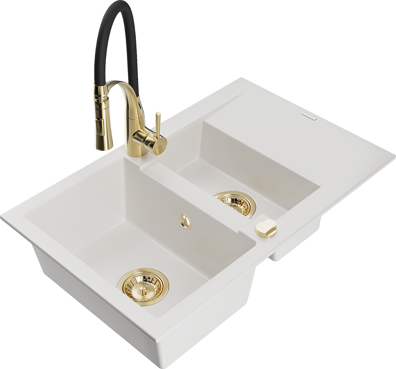 Mexen Gaspar granitinis virtuvės kriauklė su 1,5 dubeniu ir nusausintuvu bei Astero maišytuvu, balta - 6507-20-73450-57-G