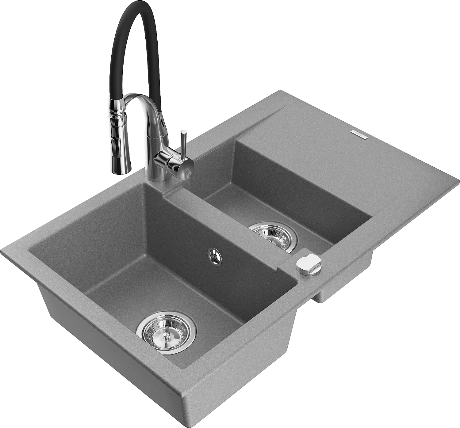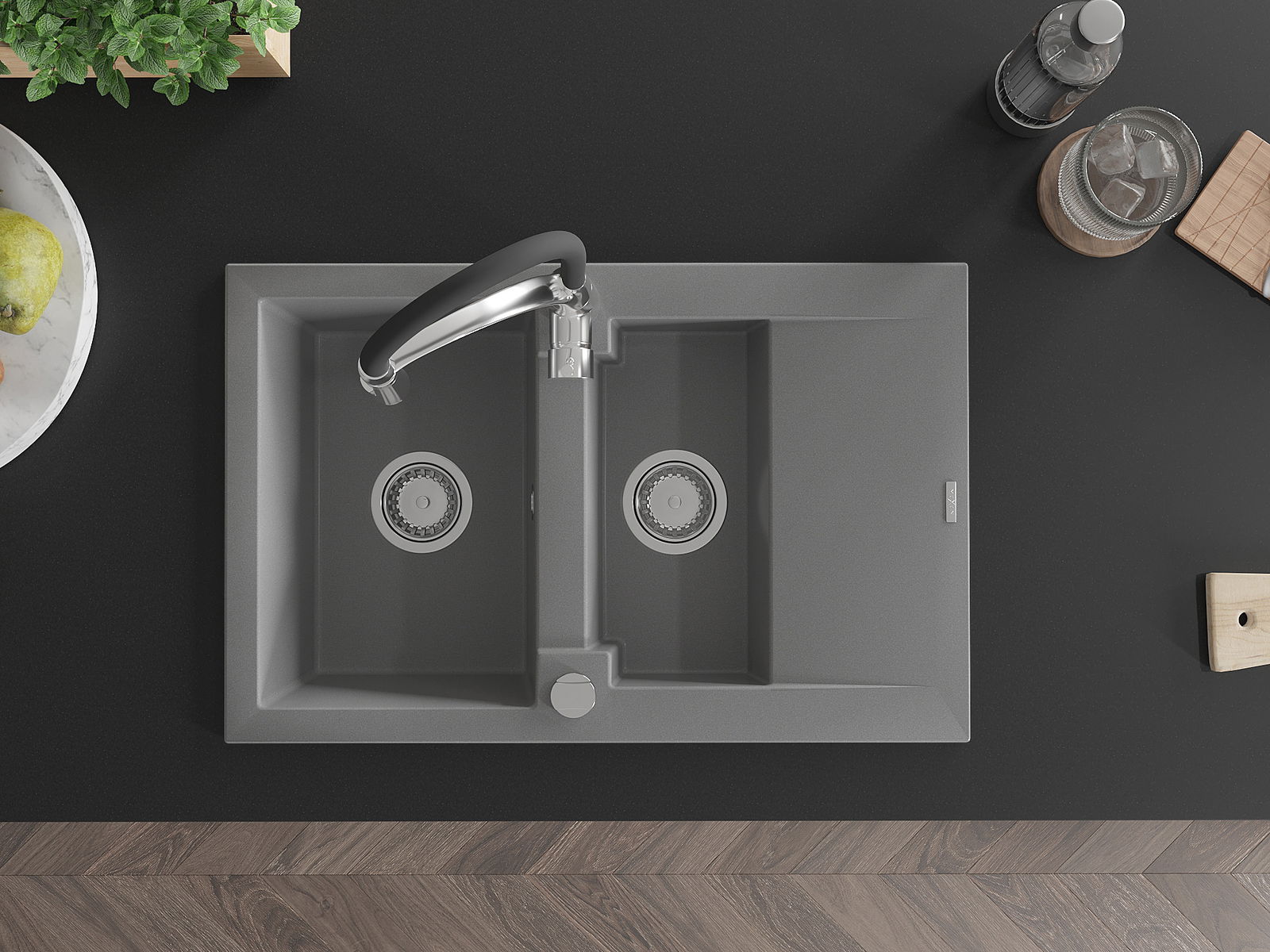 Mexen Gaspar granitinis 1,5 kameros plautuvas su nusausinimo paviršiumi ir virtuvės maišytuvu Aster, pilkas - 6507-71-73450-07