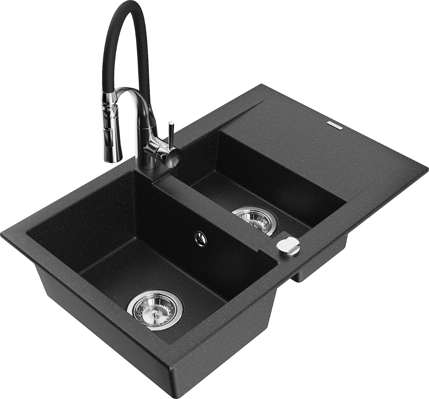 Mexen Gaspar granitinis plautuvė 1,5 skylių su drenažu ir virtuvės baterija Aster, juoda/sidabrinė metalik - 6507-73-73450-07