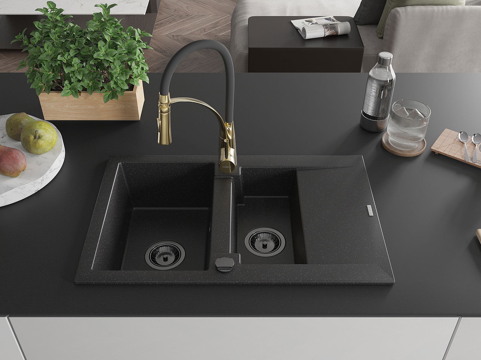 Mexen Gaspar granito plautuvė 1,5 skylių su nusausintuvu ir virtuvės maišytuvu Aster, juoda/sidabrinė - 6507-73-73450-57-B