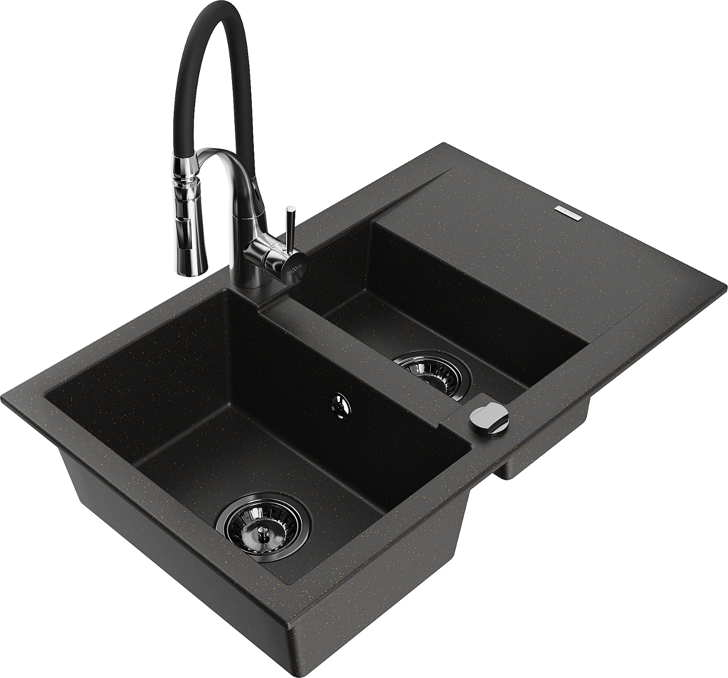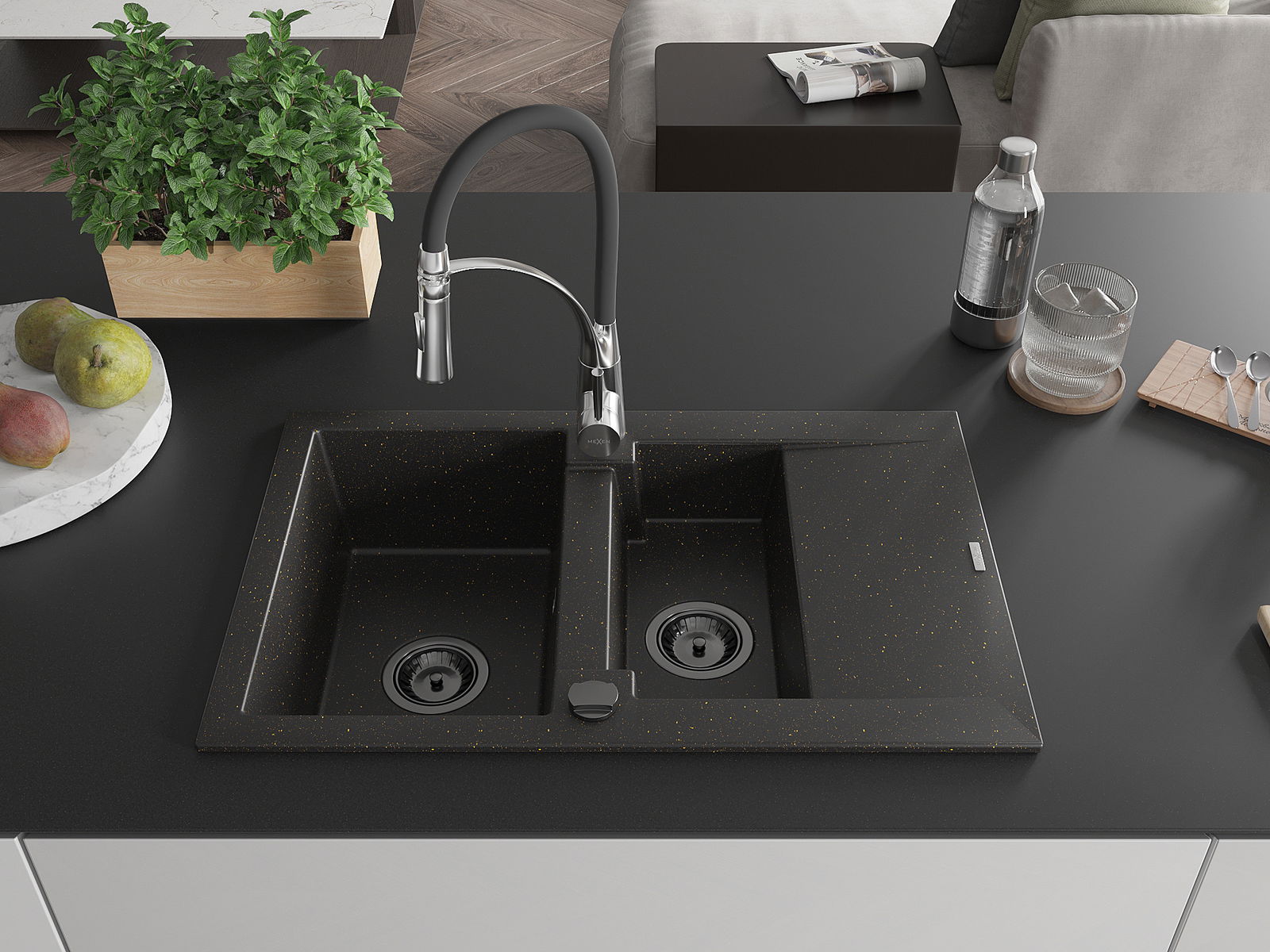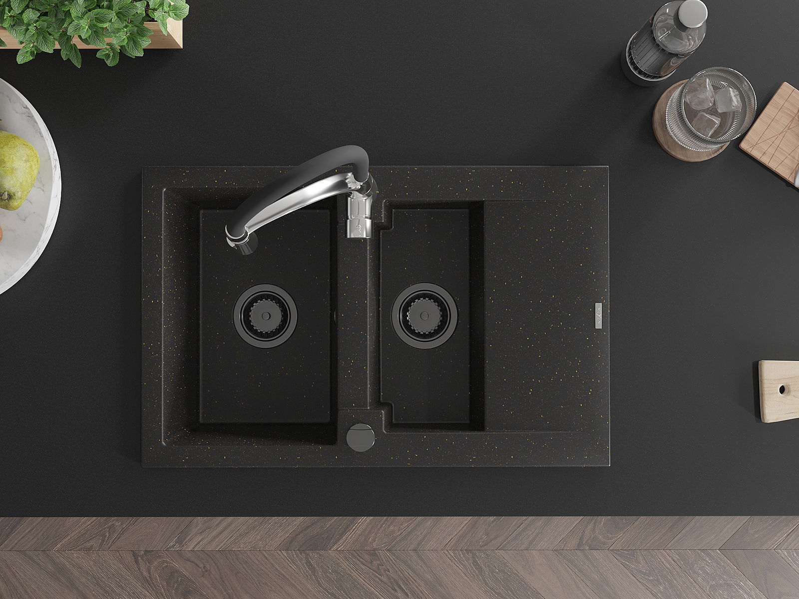 Mexen Gaspar granitinė 1,5 skylių kriauklė su nusausa ir virtuvės maišytuvu Aster, juodas/auksinis metalikas