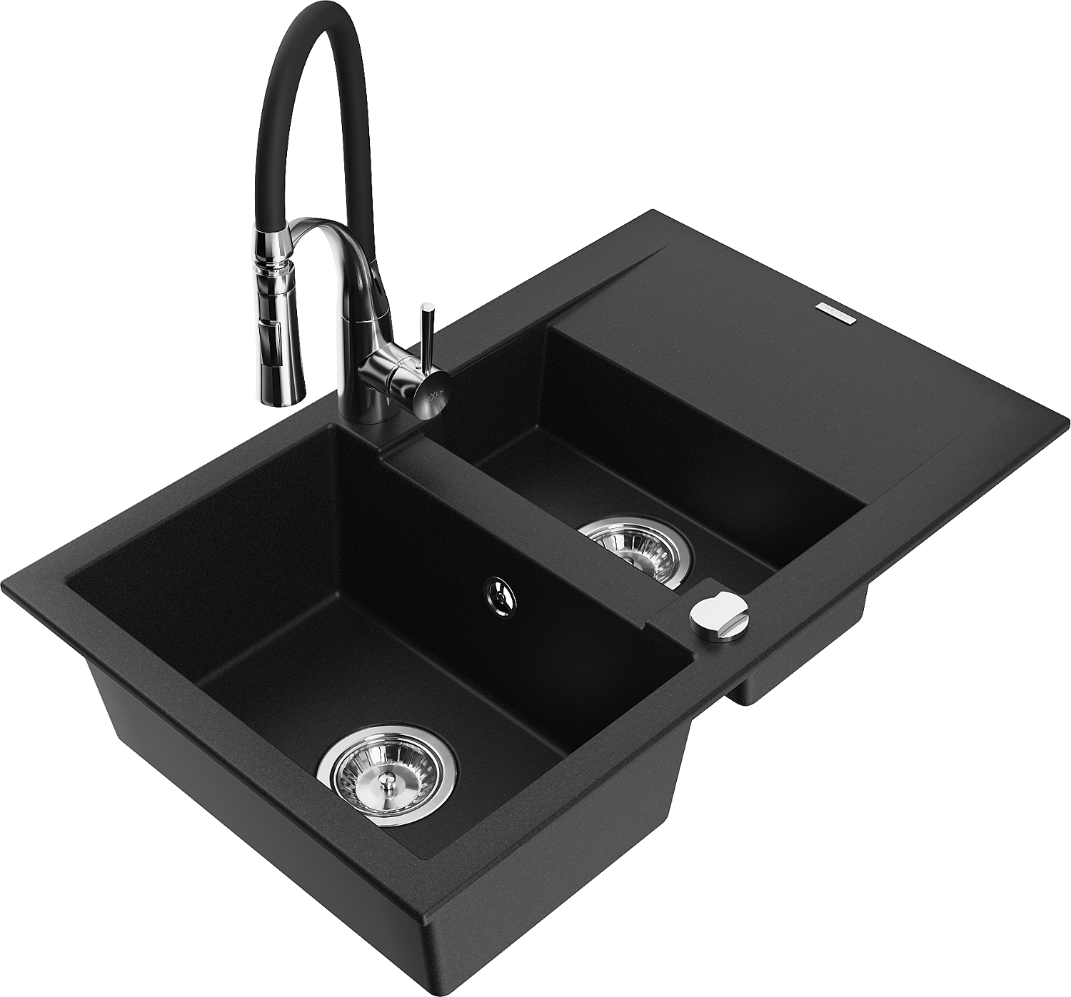 Mexen Gaspar granitinis plautuvės 1,5 kamera su lašėjimo zona ir virtuviniu maišytuvu Aster, juodas - 6507-77-73450-07