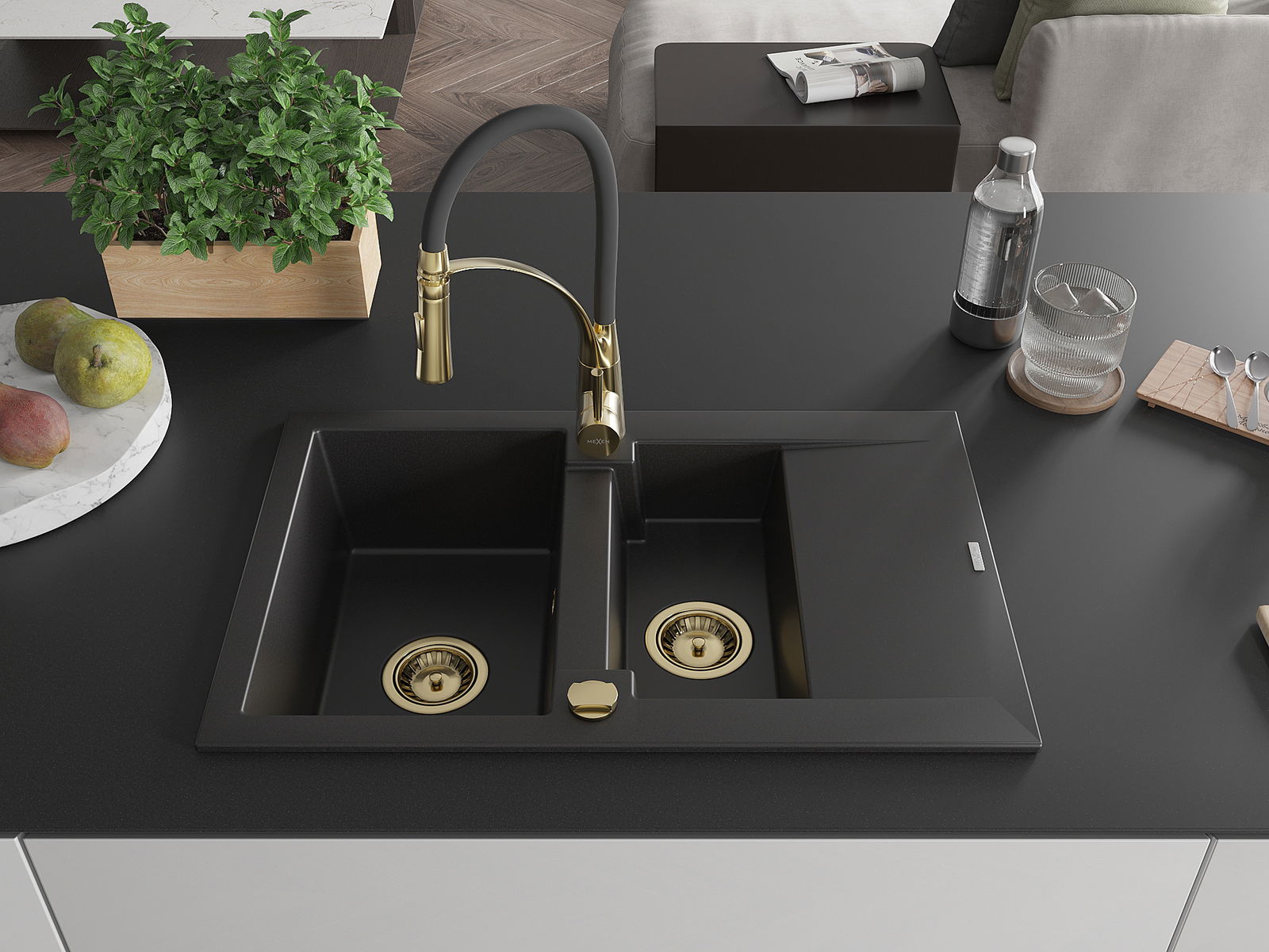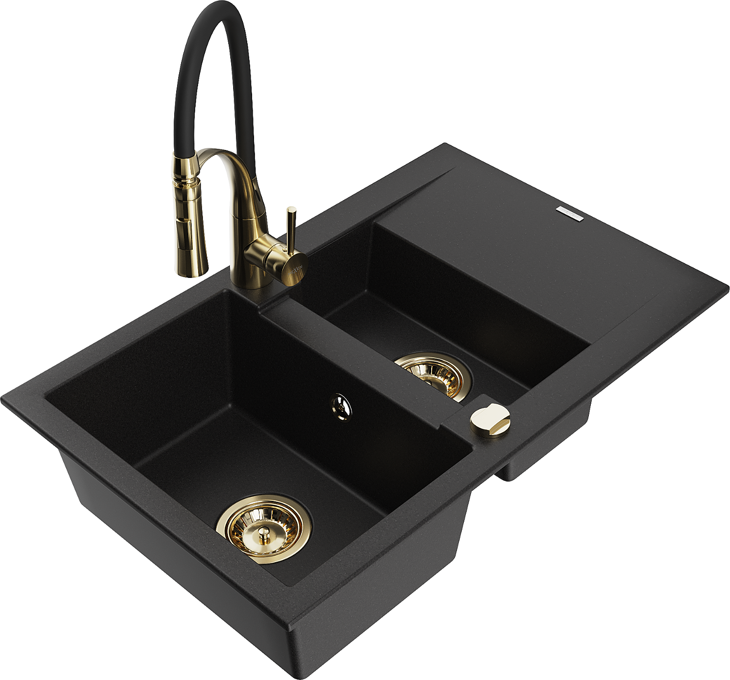 Mexen Gaspar 1,5 sekcijų granitinė plautuvė su nuvarvėjimo lentyna ir virtuviniu maišytuvu Aster, juoda - 6507-77-73450-57-G