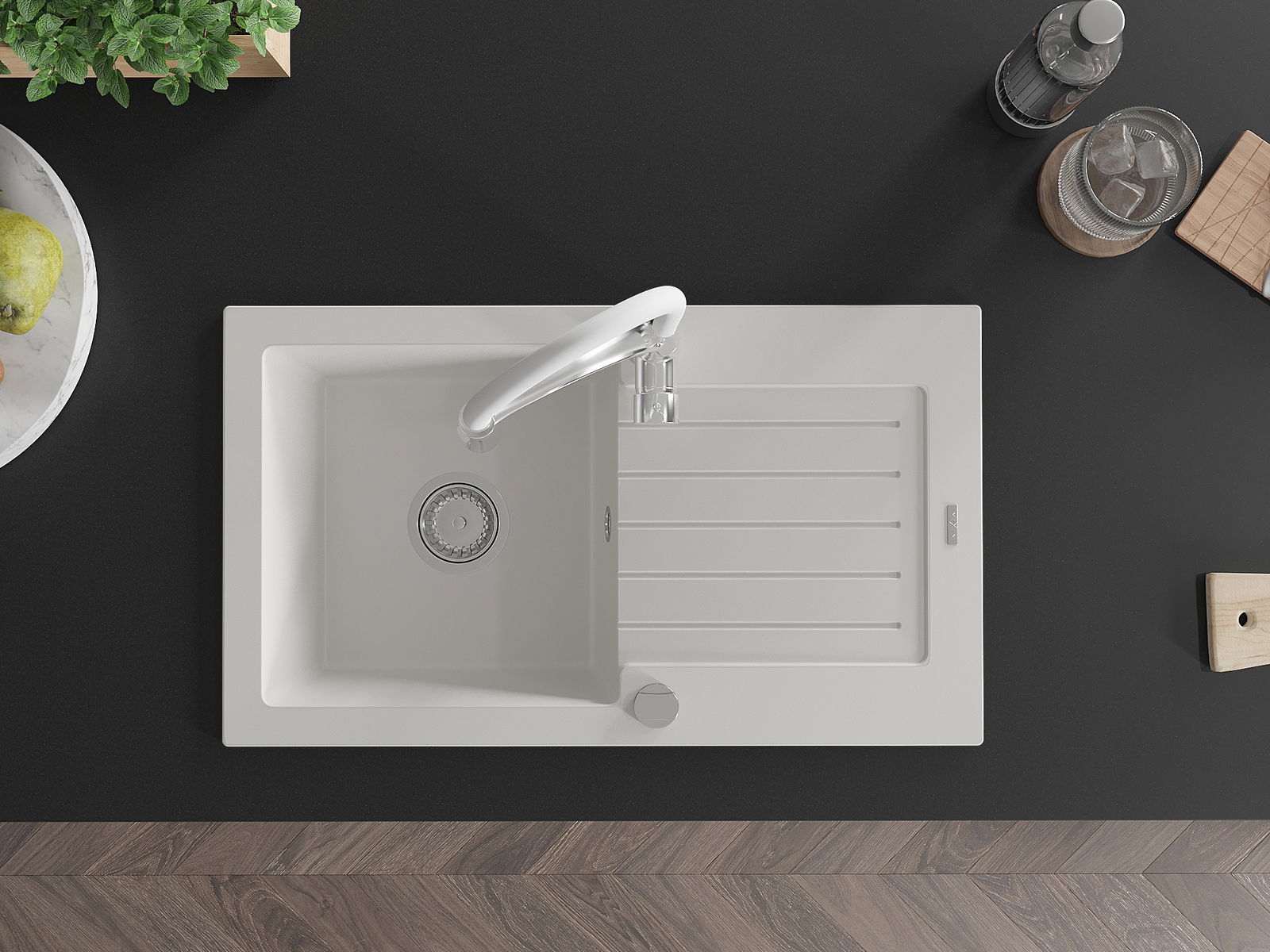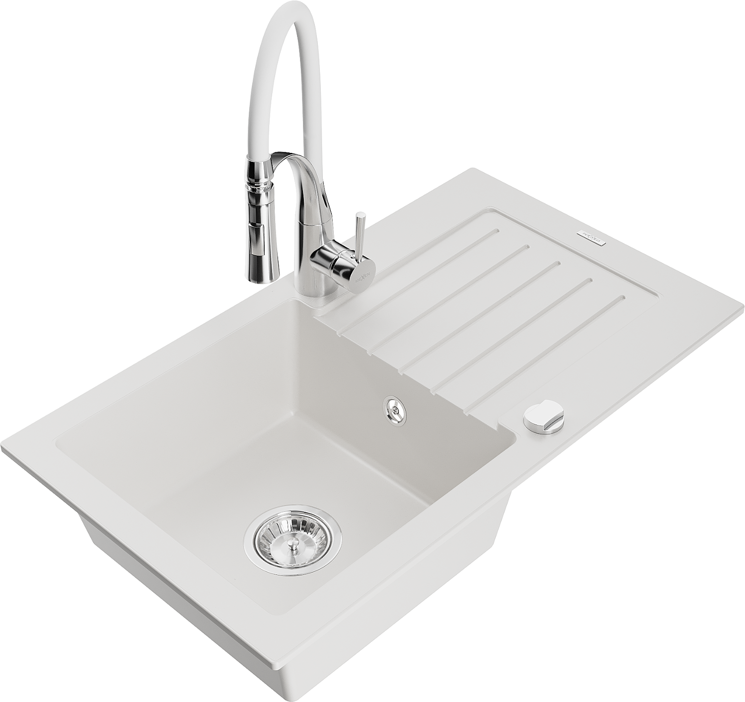 Mexen Pablo granitinė vienos dalies kriauklė su nutekamąja dalimi ir virtuviniu maišytuvu Aster, balta - 6510-20-73450-02