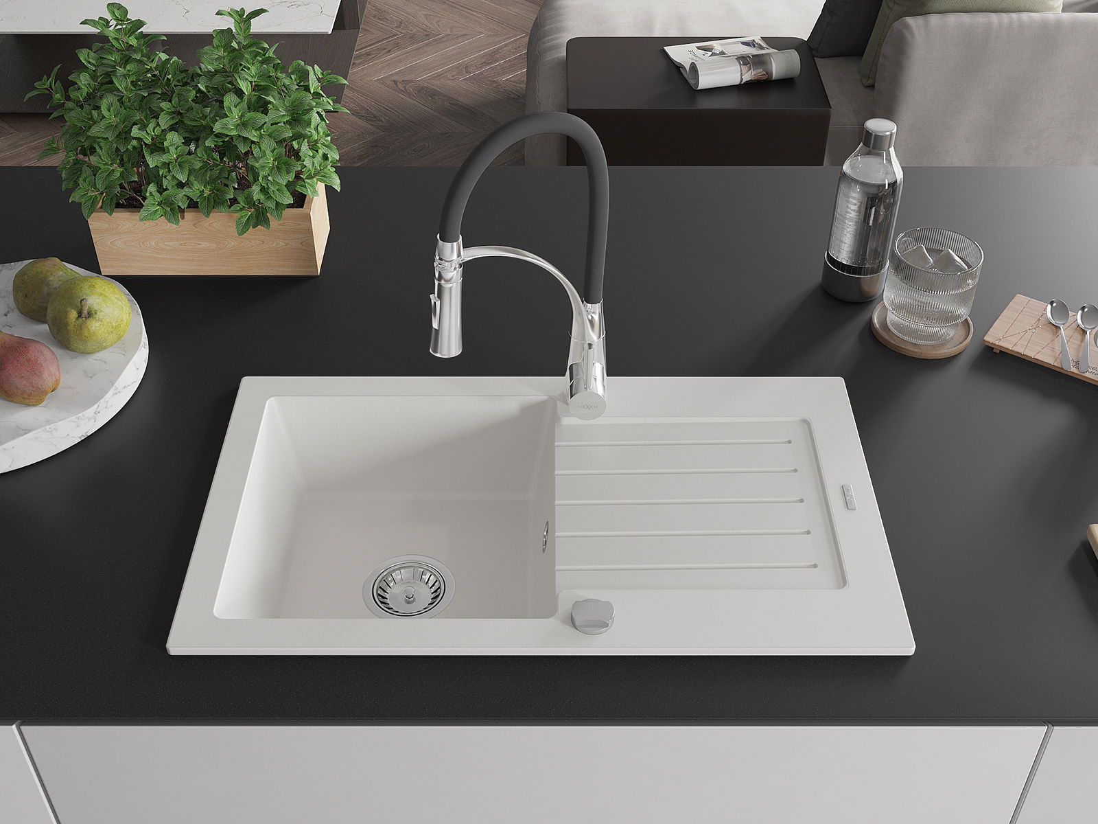 Mexen Pablo vienos kameros granito kriauklė su nuvarvėju ir virtuviniu maišytuvu Aster, balta - 6510-20-73450-07