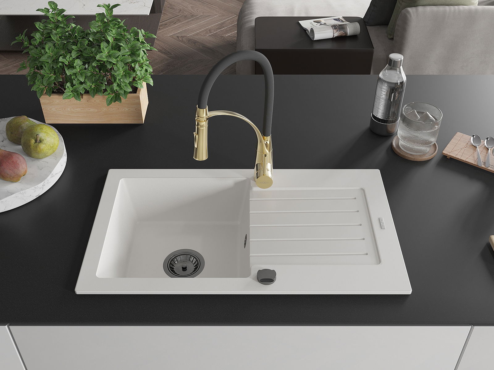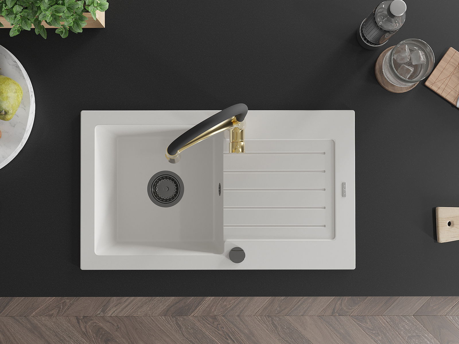Mexen Pablo granito virtuvės kriauklė 1 skyrius su nusausintuvu ir virtuviniu maišytuvu Aster, balta - 6510-20-73450-57-B