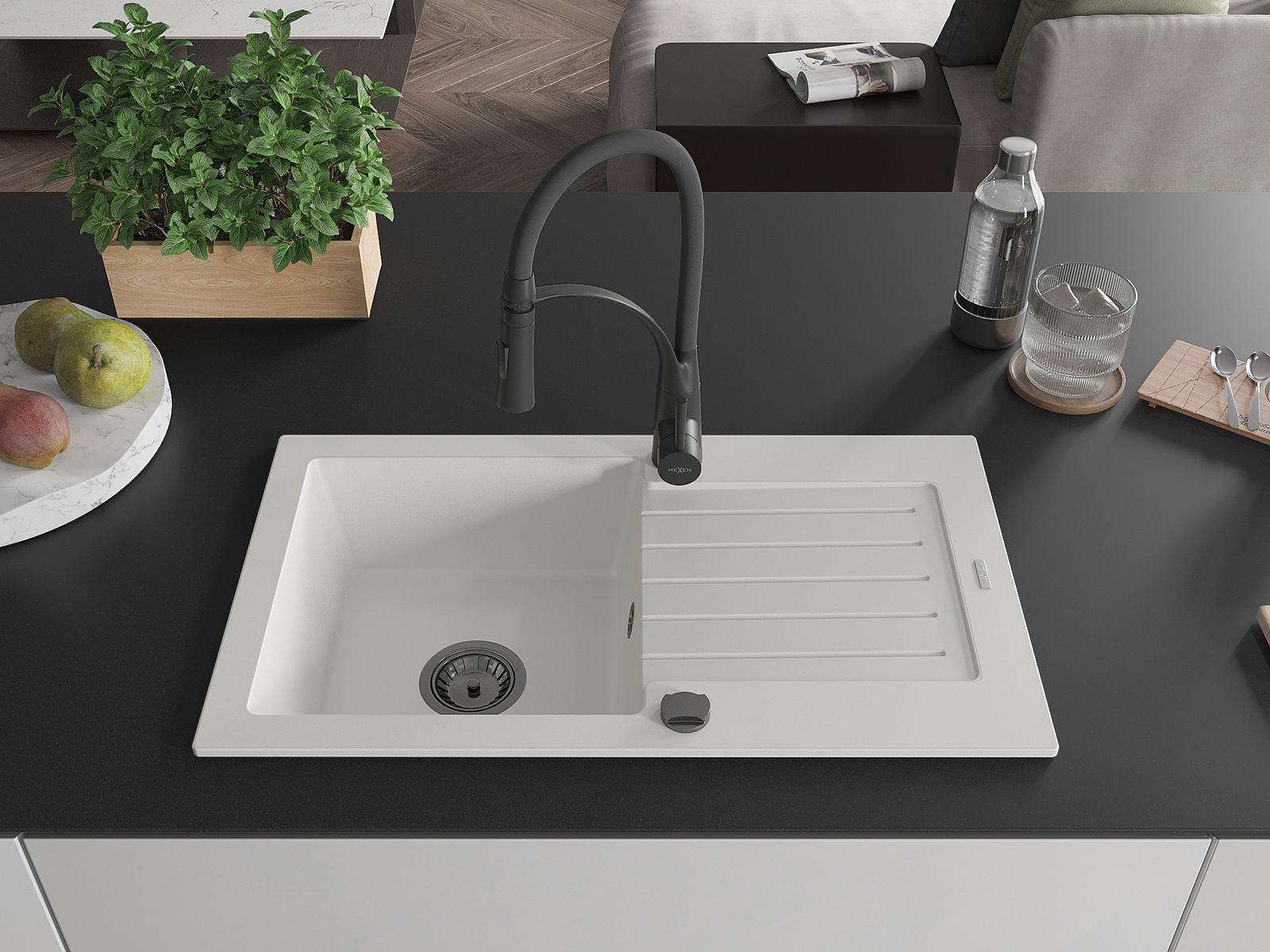 Mexen Pablo granito virtuvės kriauklė su nutekėjimu ir virtuvės maišytuvu Aster, balta - 6510-20-73450-70-B