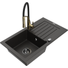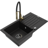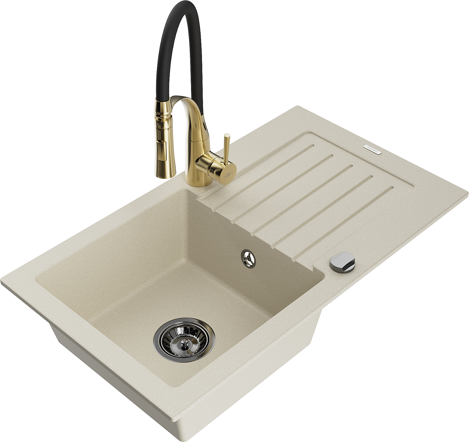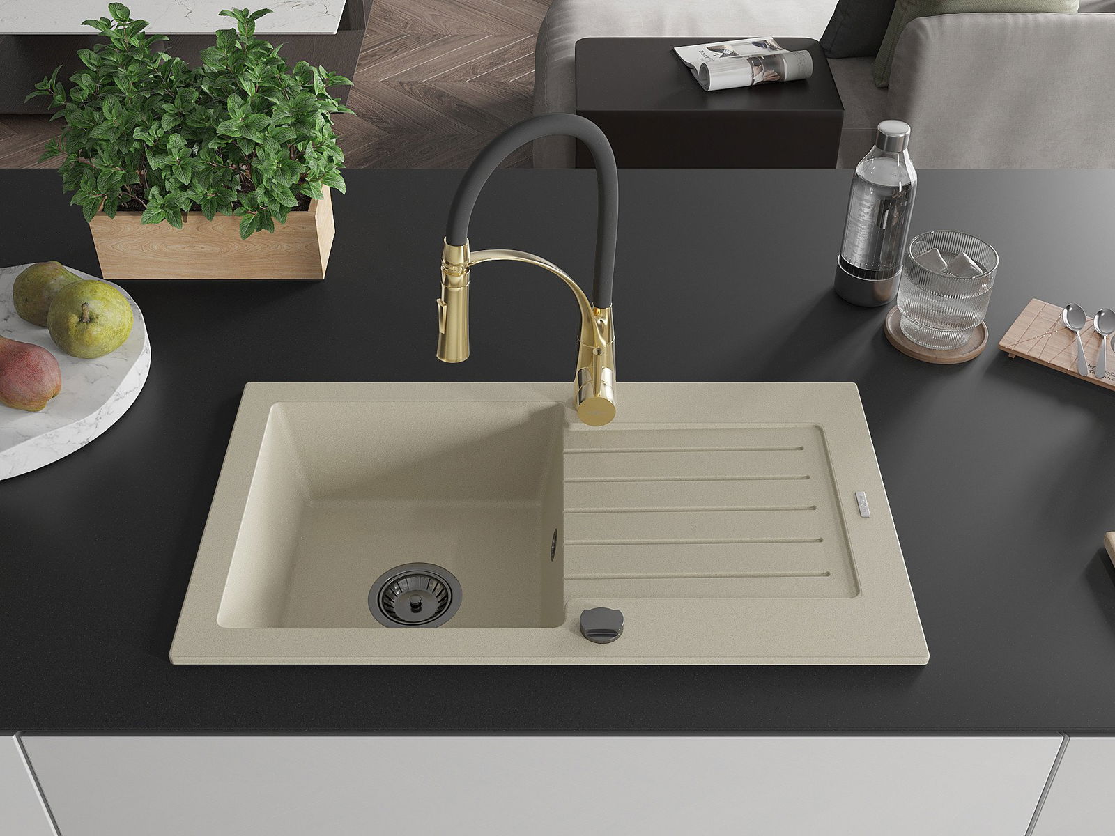Mexen Pablo vieno dubens granitinė virtuvinė kriauklė su nusausintuvu ir virtuviniu maišytuvu „Aster“, smėlio spalvos