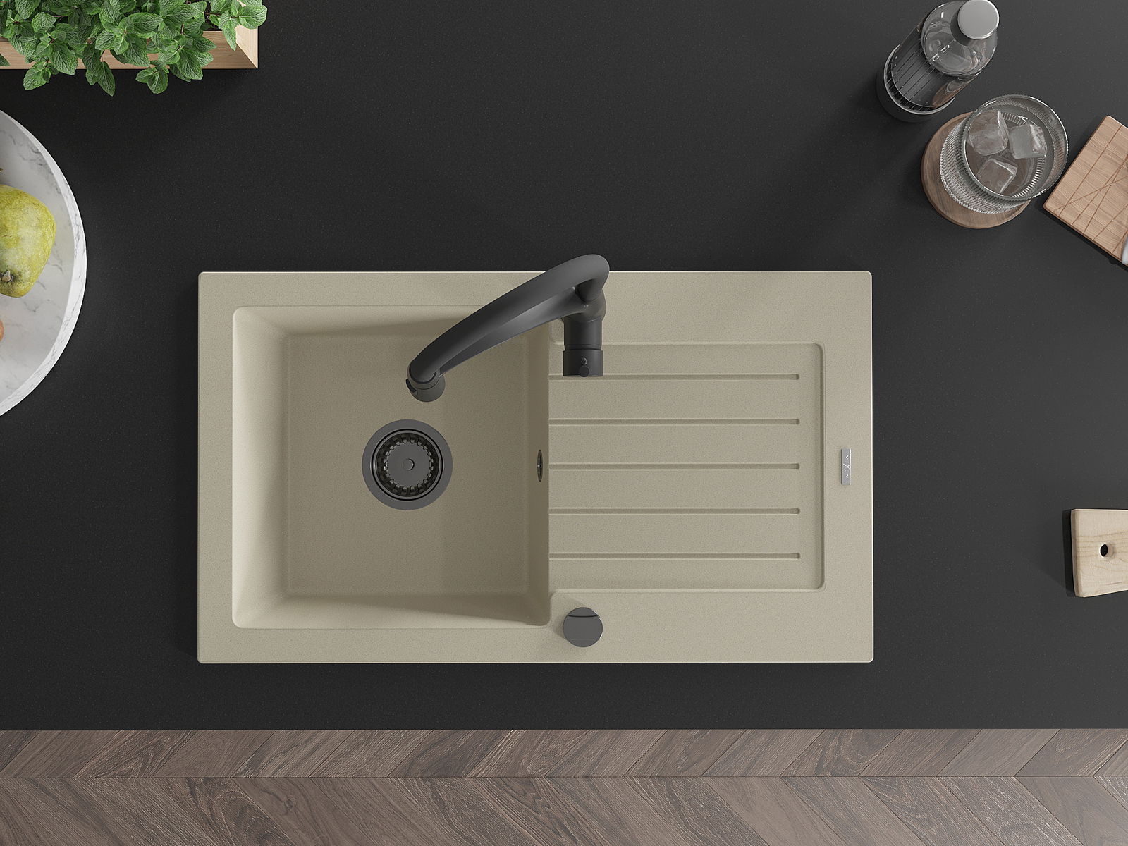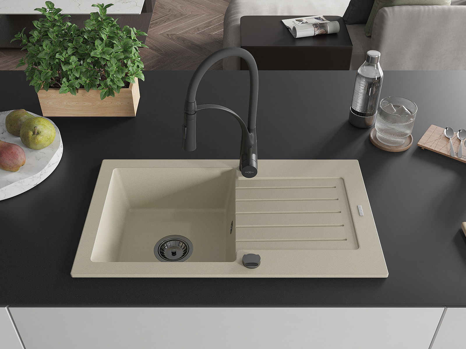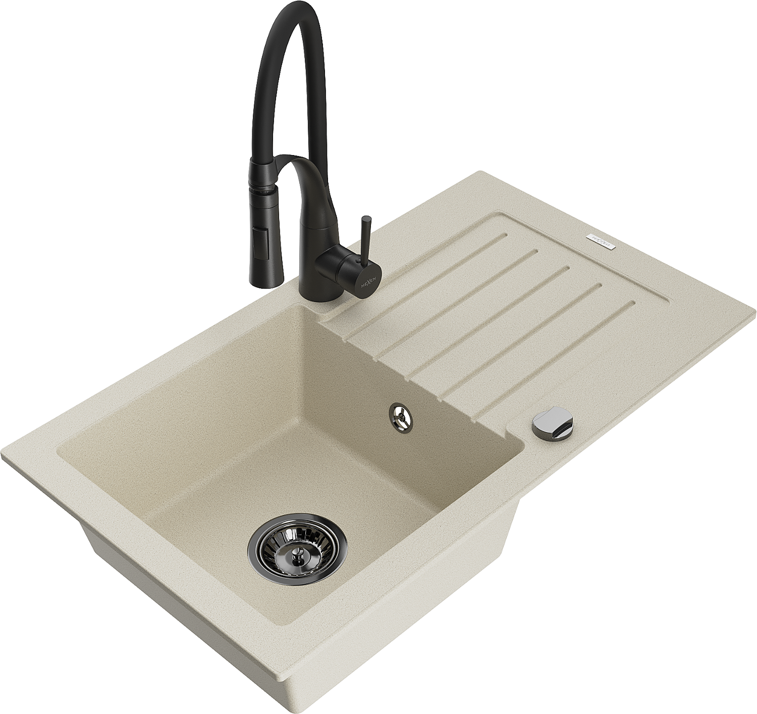 Mexen Pablo granito plautuvė su 1 skyriumi ir nusausintuvu bei virtuviniu maišytuvu Aster, smėlio spalvos - 6510-69-73450-70-B