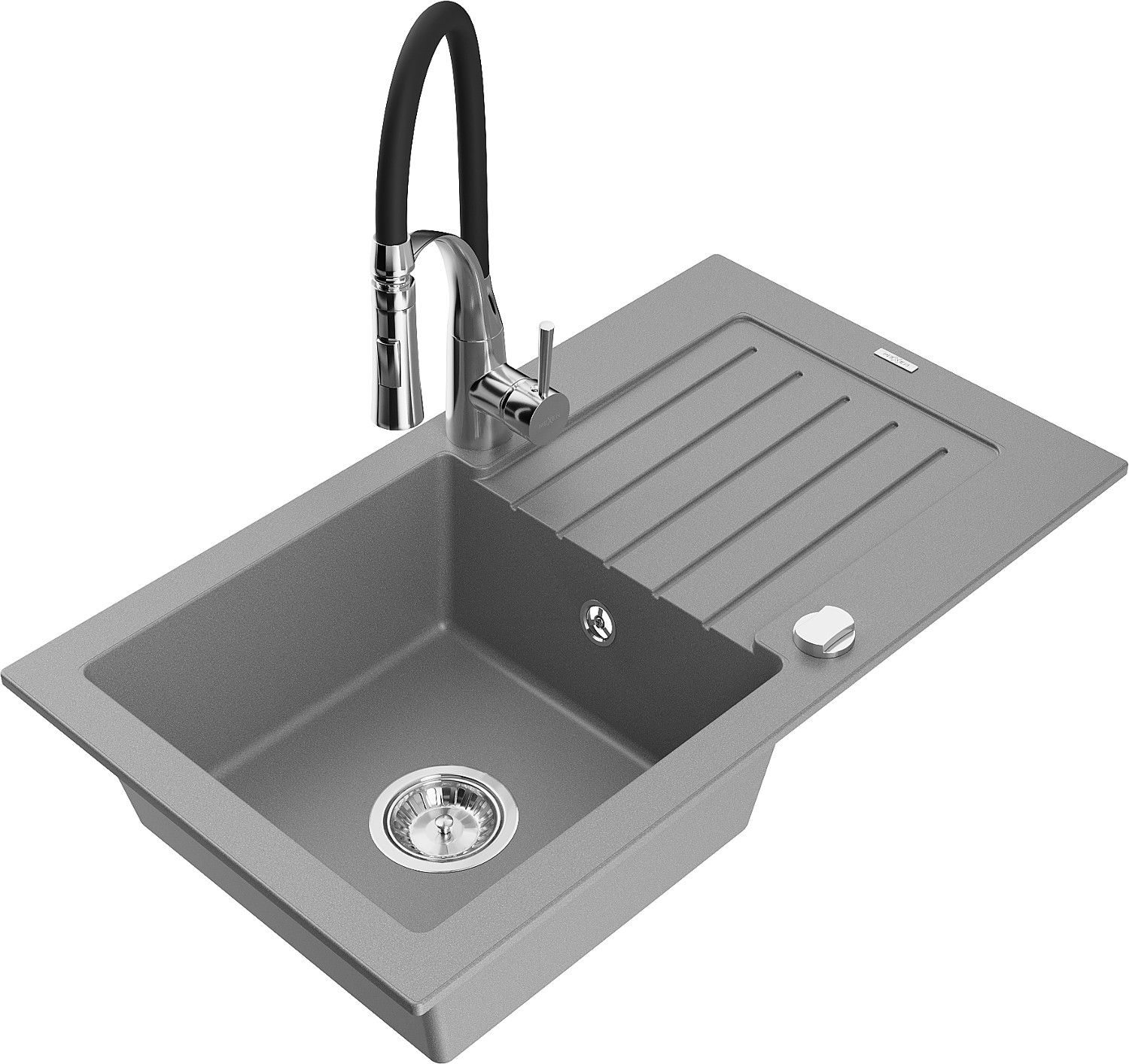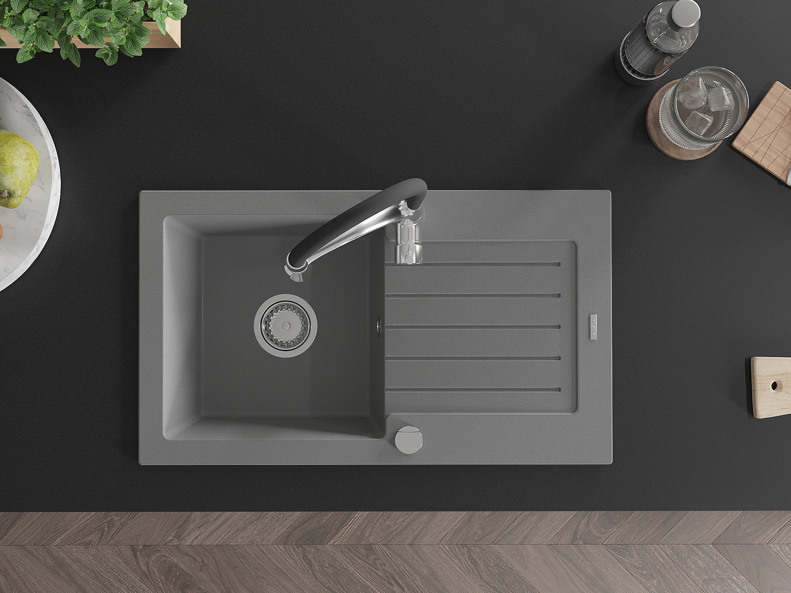Mexen Pablo granitinis vienos sekcijos plautuvė su nusausintuvu ir virtuviniu maišytuvu Aster, pilka - 6510-71-73450-07