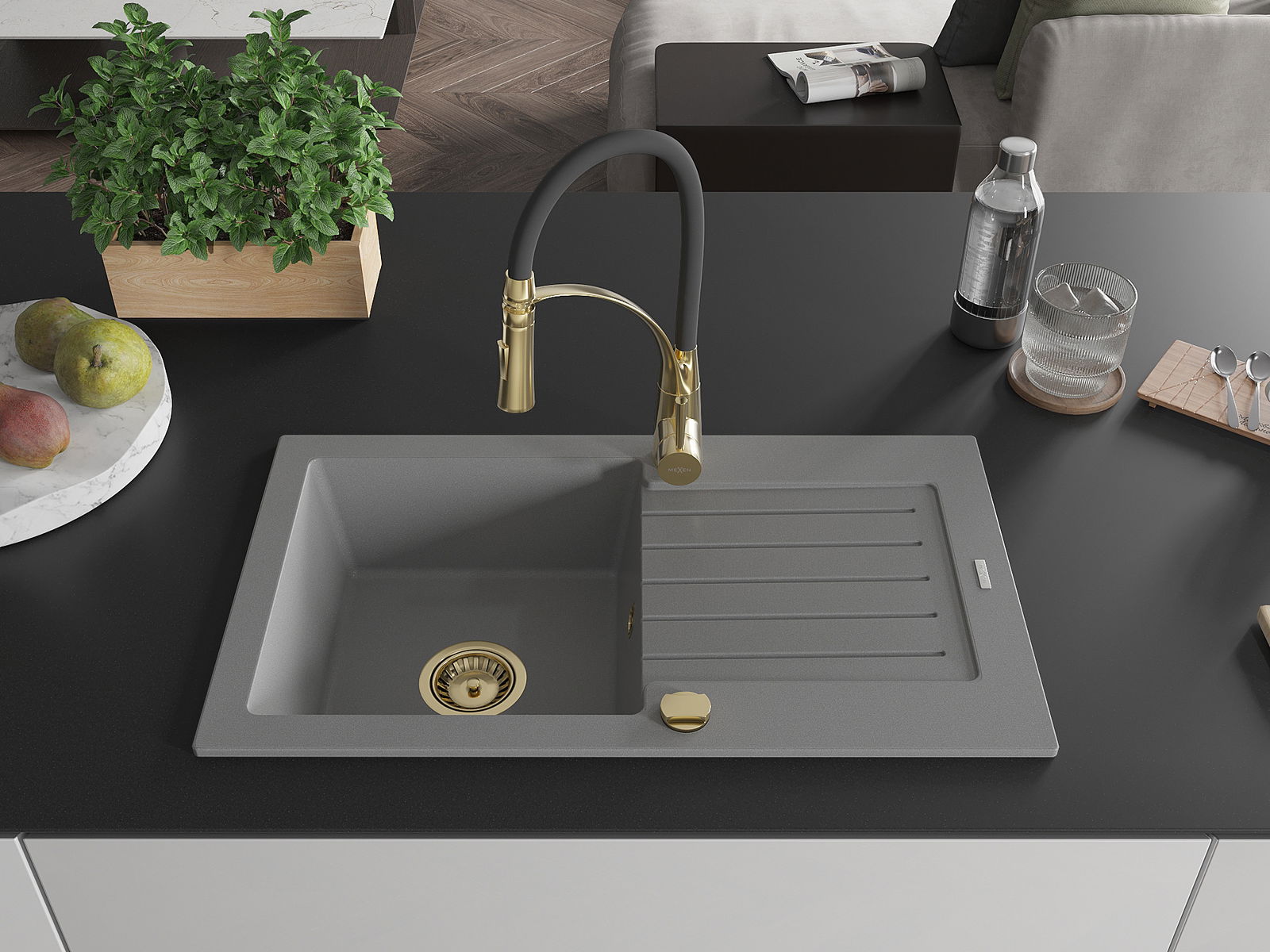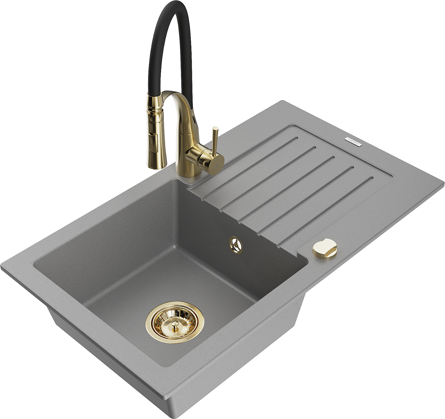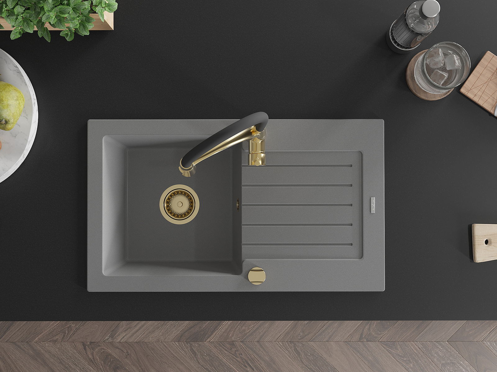 Mexen Pablo granitinis virtuvės kriauklė 1 skyrius su nuvarvėjimu ir virtuvės maišytuvu Aster, pilka - 6510-71-73450-57-G