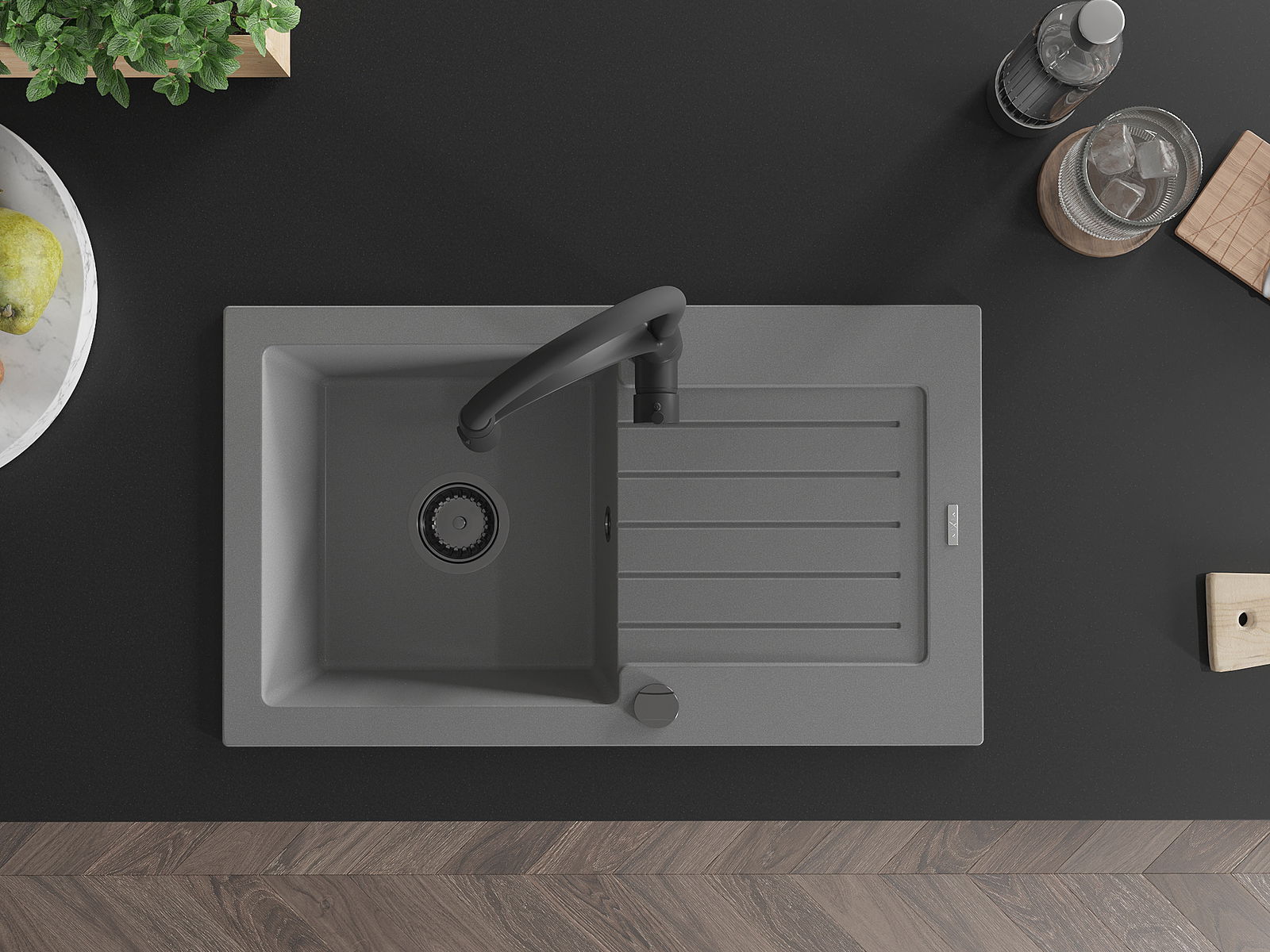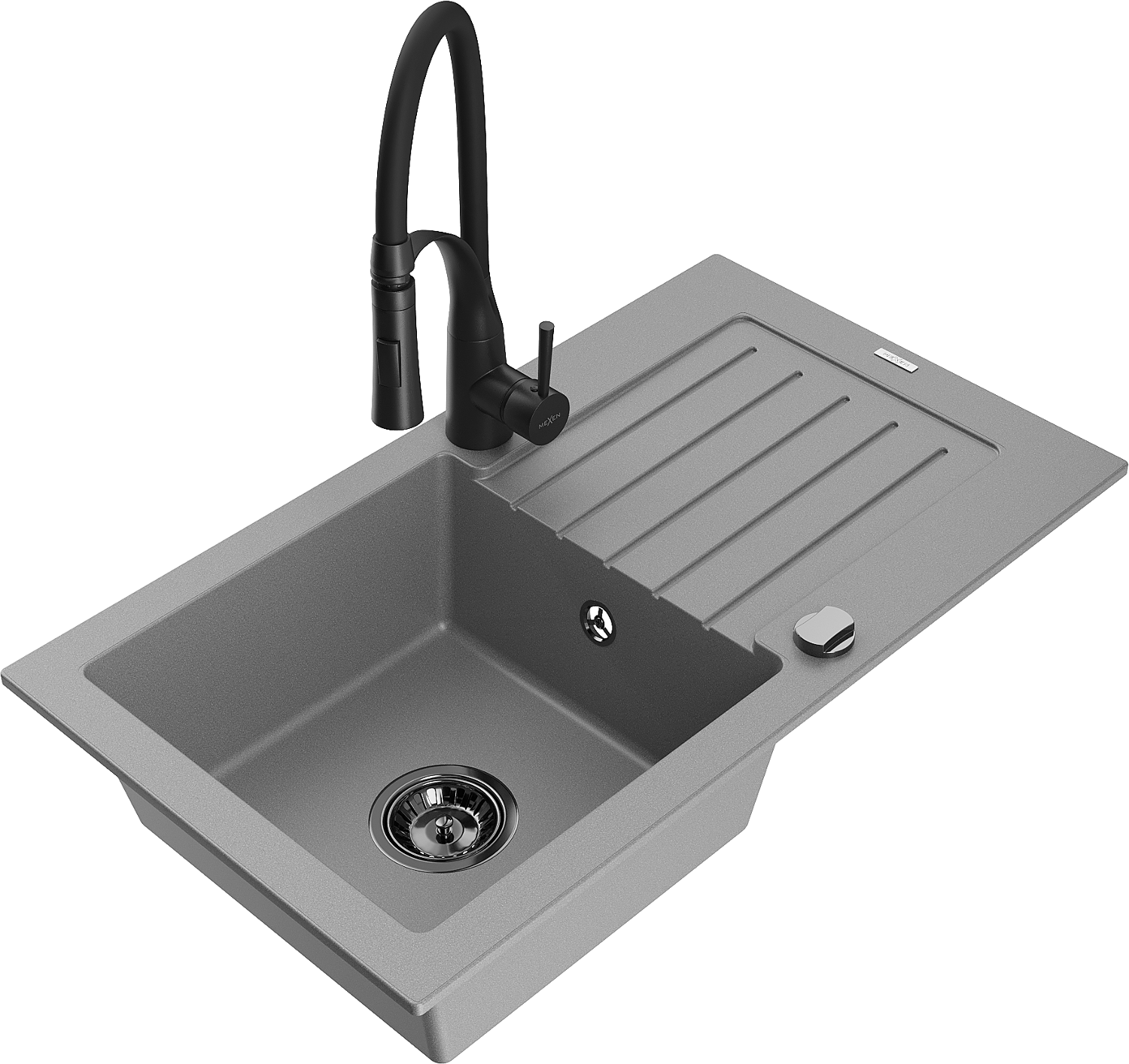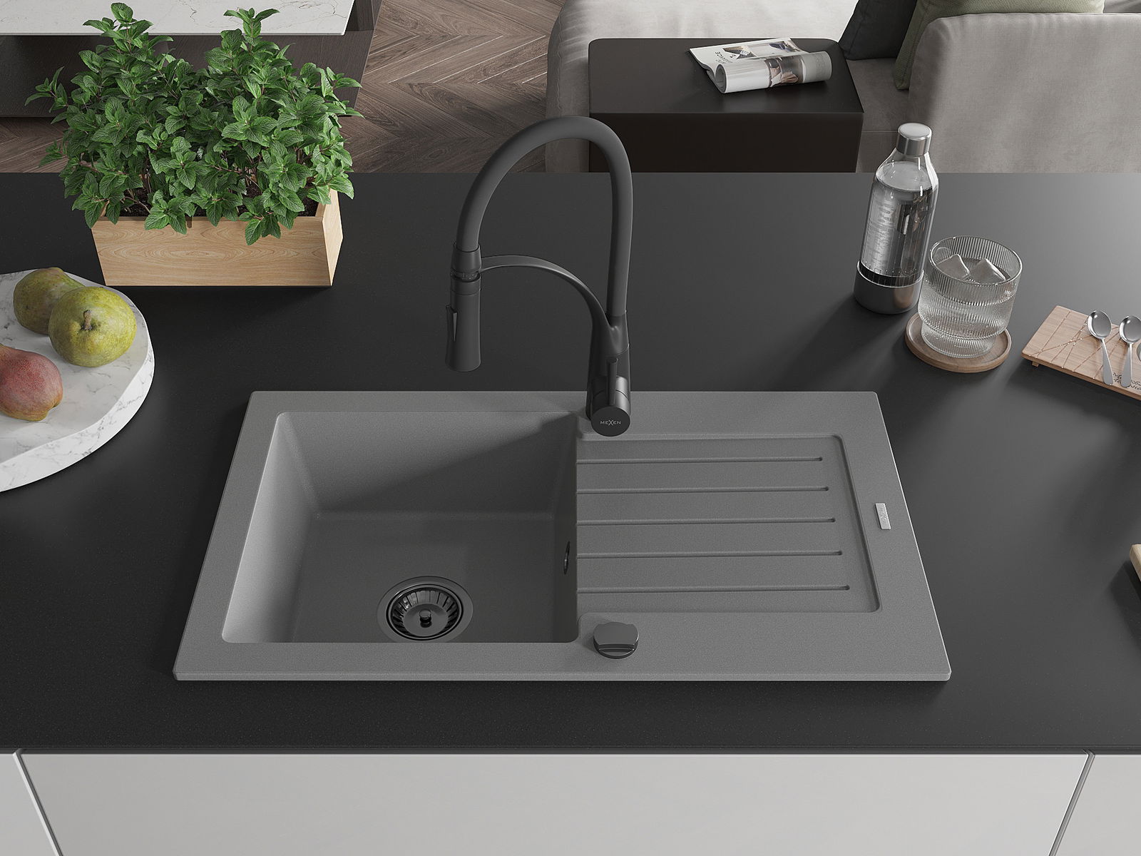 Mexen Pablo granito virtuvės plautuvė su viena plautuvine ir nutekėjimu ir virtuvės maišytuvu Aster, pilka - 6510-71-73450-70-B
