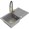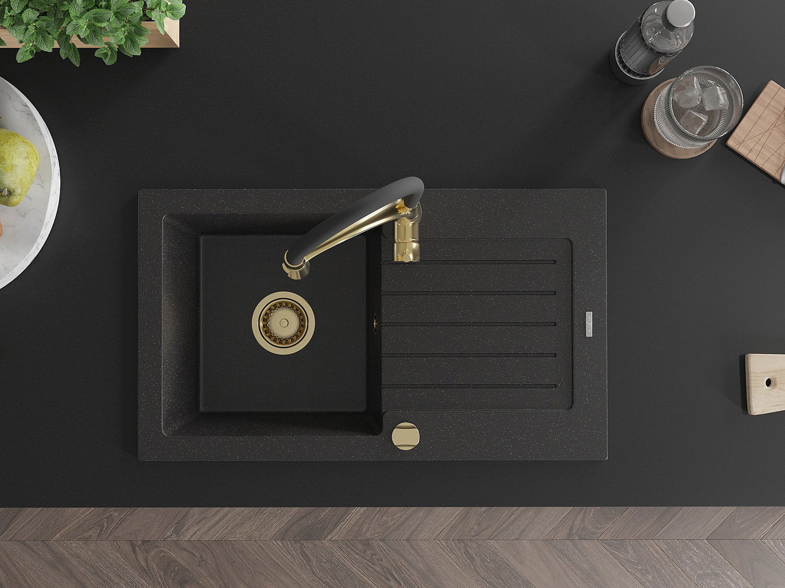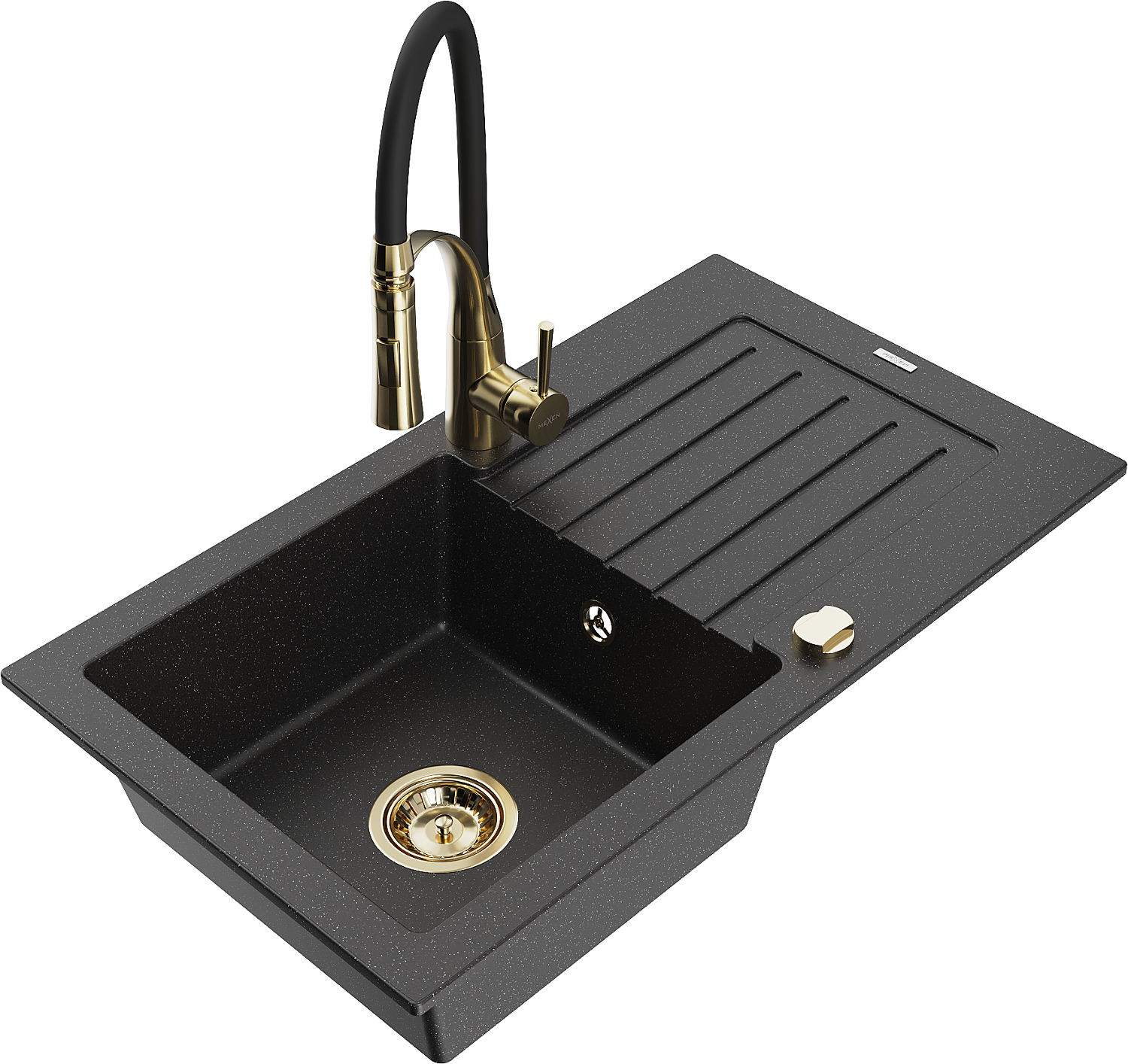 Mexen Pablo granitinė vienos kameros kriauklė su nusausintuvu ir virtuviniu maišytuvu Aster, juoda/sidabrinė metaliko