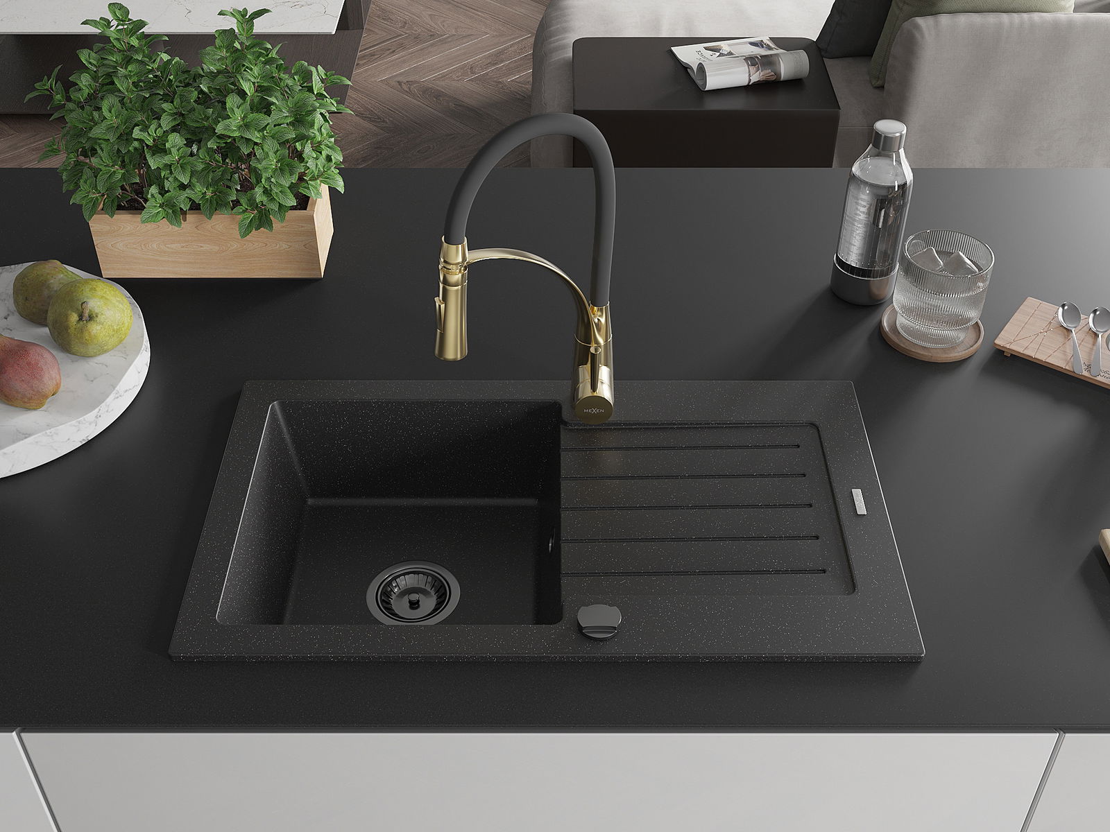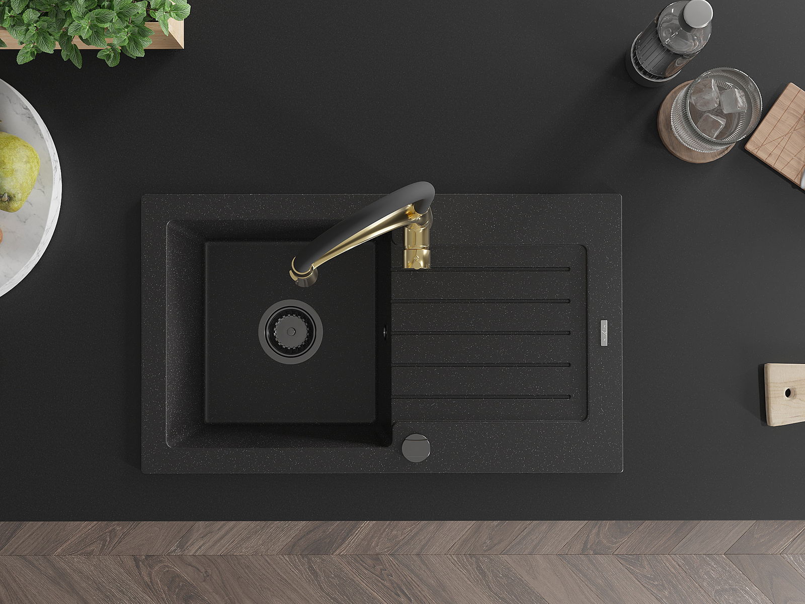 Mexen Pablo granitinė vienos kameros virtuvės kriauklė su nutekėjimu ir virtuviniu maišytuvu „Aster“, juodas/sidabrinis