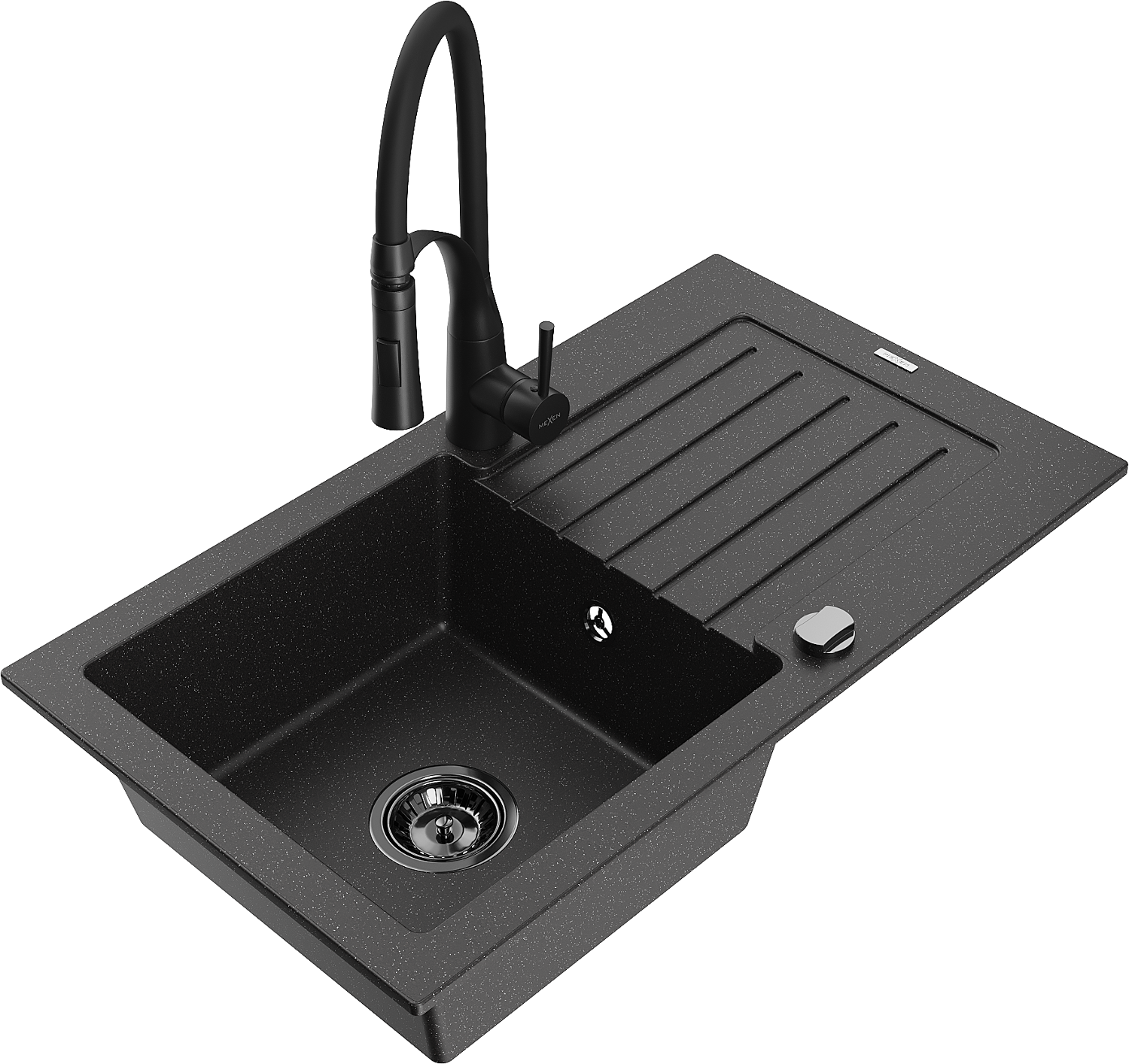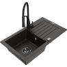 Mexen Pablo granitinis vienos kameros plautuvė su nusausinimo paviršiumi ir virtuviniu maišytuvu Aster, juodas/sidabrinis