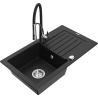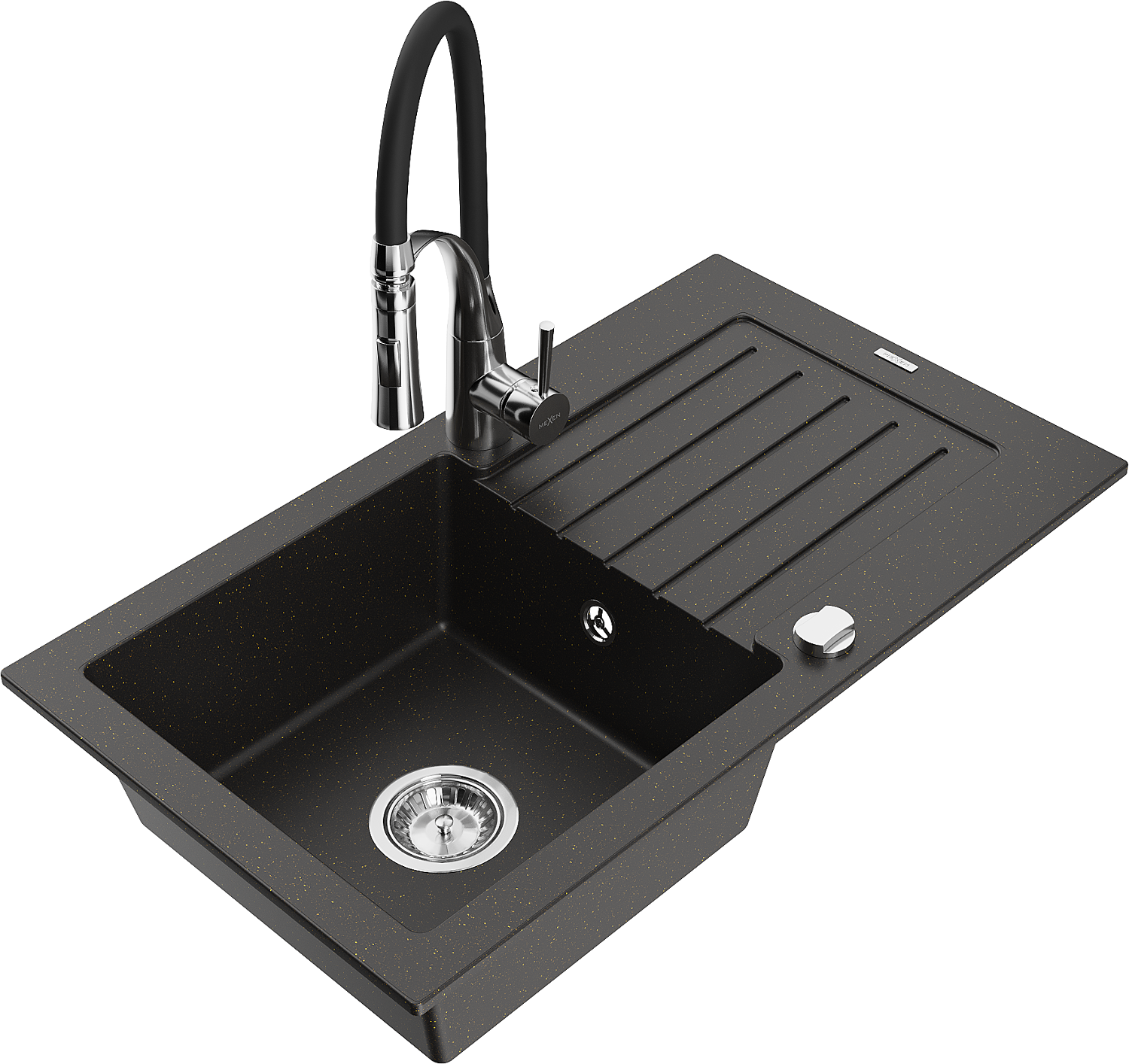 Mexen Pablo granitinė vienos kameros plautuvė su nusausintuvu ir virtuviniu maišytuvu Aster, juodas/auksinis metalikas